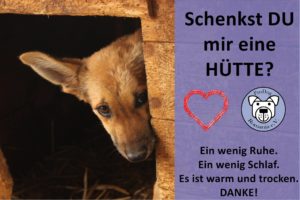 Bitte helft uns mit einer kleinen Spende, denn die Hütten sind überlebenswichtig für die Hunde im Auffanglager.