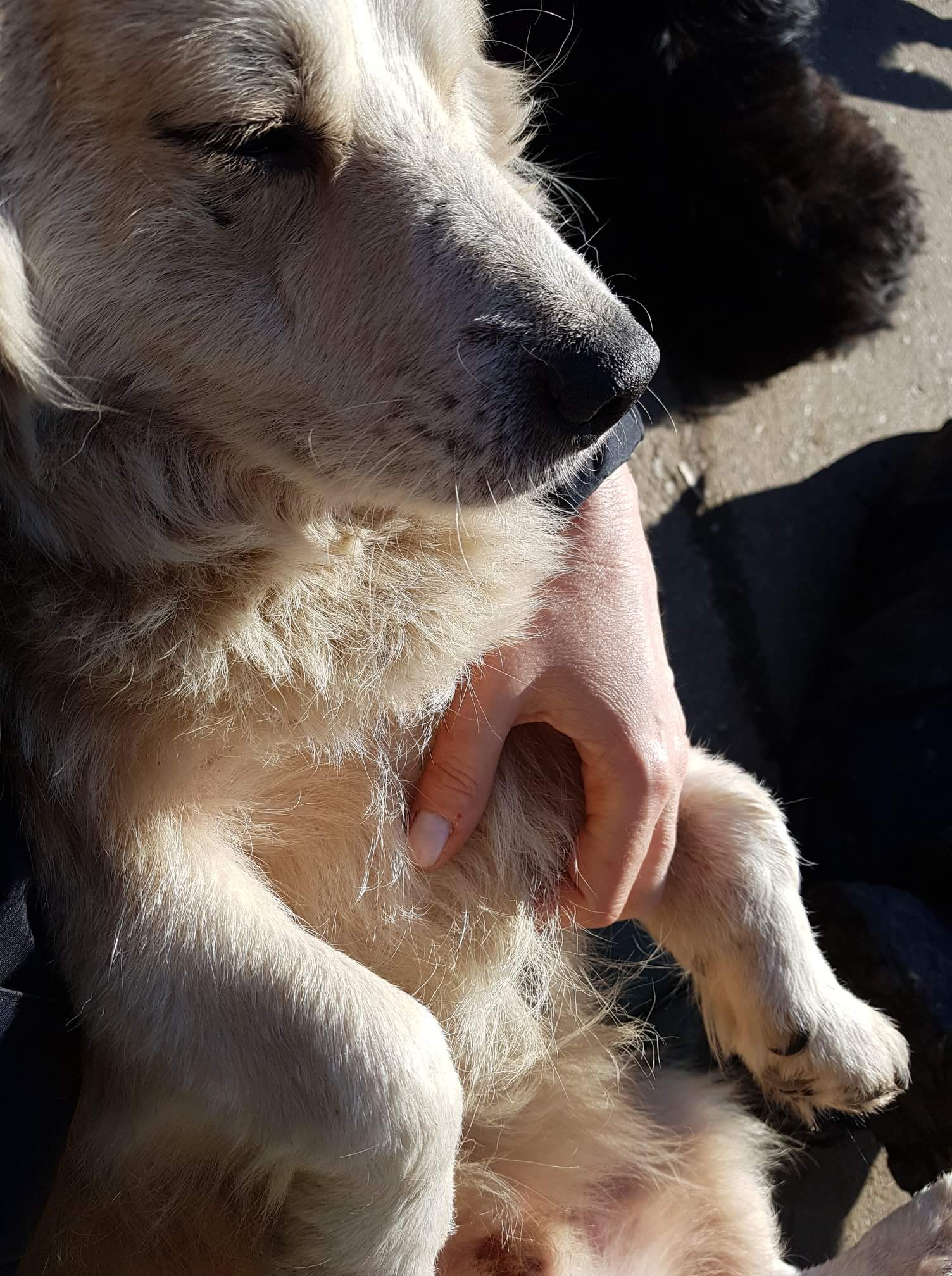 Mittags waren wir alle ziemlich geschafft und haben uns eine kurze Auszeit genommen.. einfach mit den Hunden mitten auf dem Weg in der Sonne auf dem Boden chillen… es war herrlich. Bifi hat uns köstlich unterhalten (oder wir sie?), die anderen Hunde wurden auch beschmust und gekuschelt und wir haben unsere Gesichter in die Sonne gehalten.