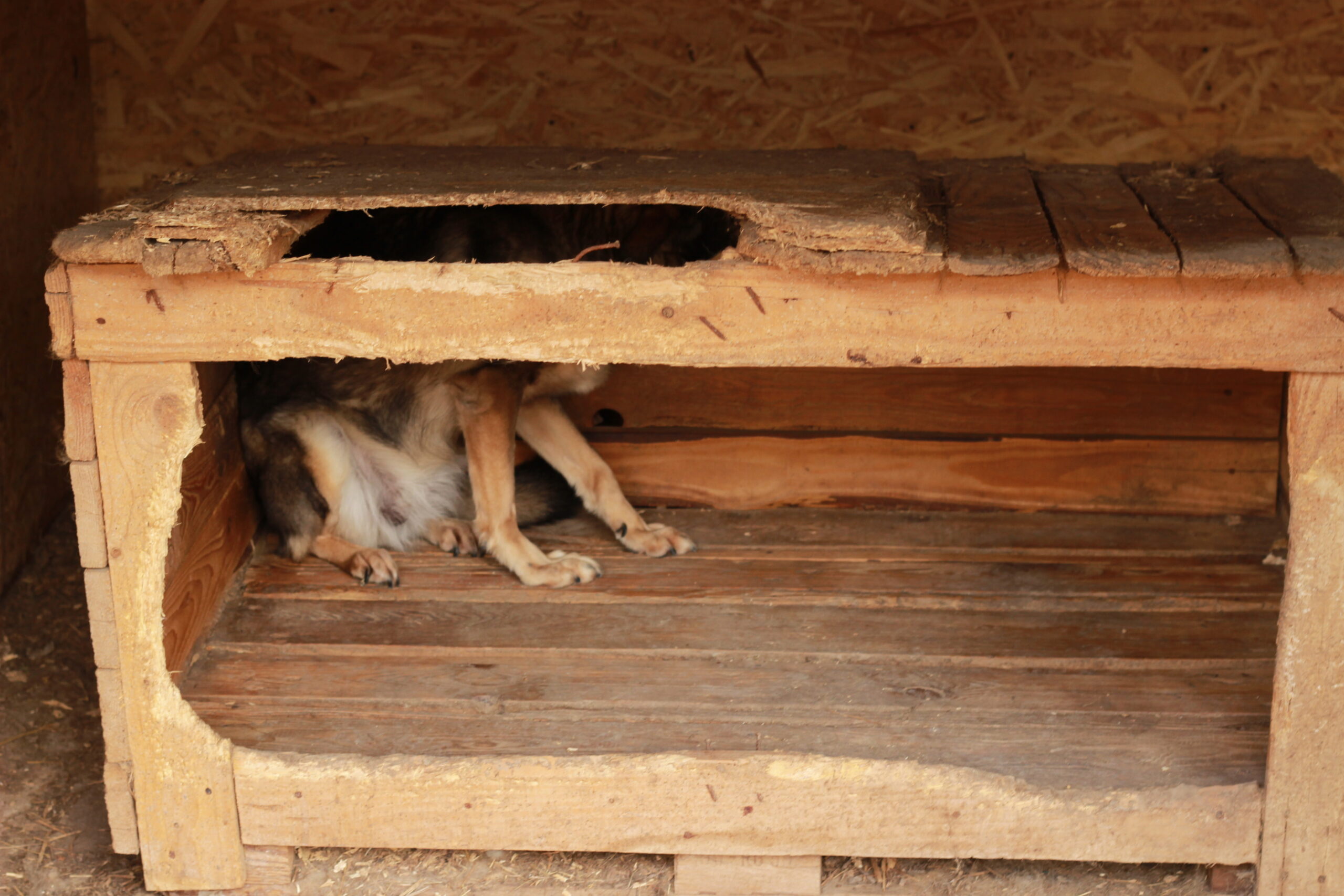 Gogu hat mit Florian zusammen in den Kennels dann das Holz abgesägt, damit mehr Licht in die Kennels kommt. Wir haben alles dann rausgebrochen und mit dem Traktor und Anhänger rausgefahren. Jetzt haben die Hunde viel Luft und Platz, dennoch aber auch Schatten und Regenschutz. Es wird nun aber sehr deutlich, dass sehr viele Hütten ausgetauscht werden müssen und weitere Liegeflächen gebraucht werden. Das soll morgen alles passieren, ich hoffe, wir schaffen es zeitlich.