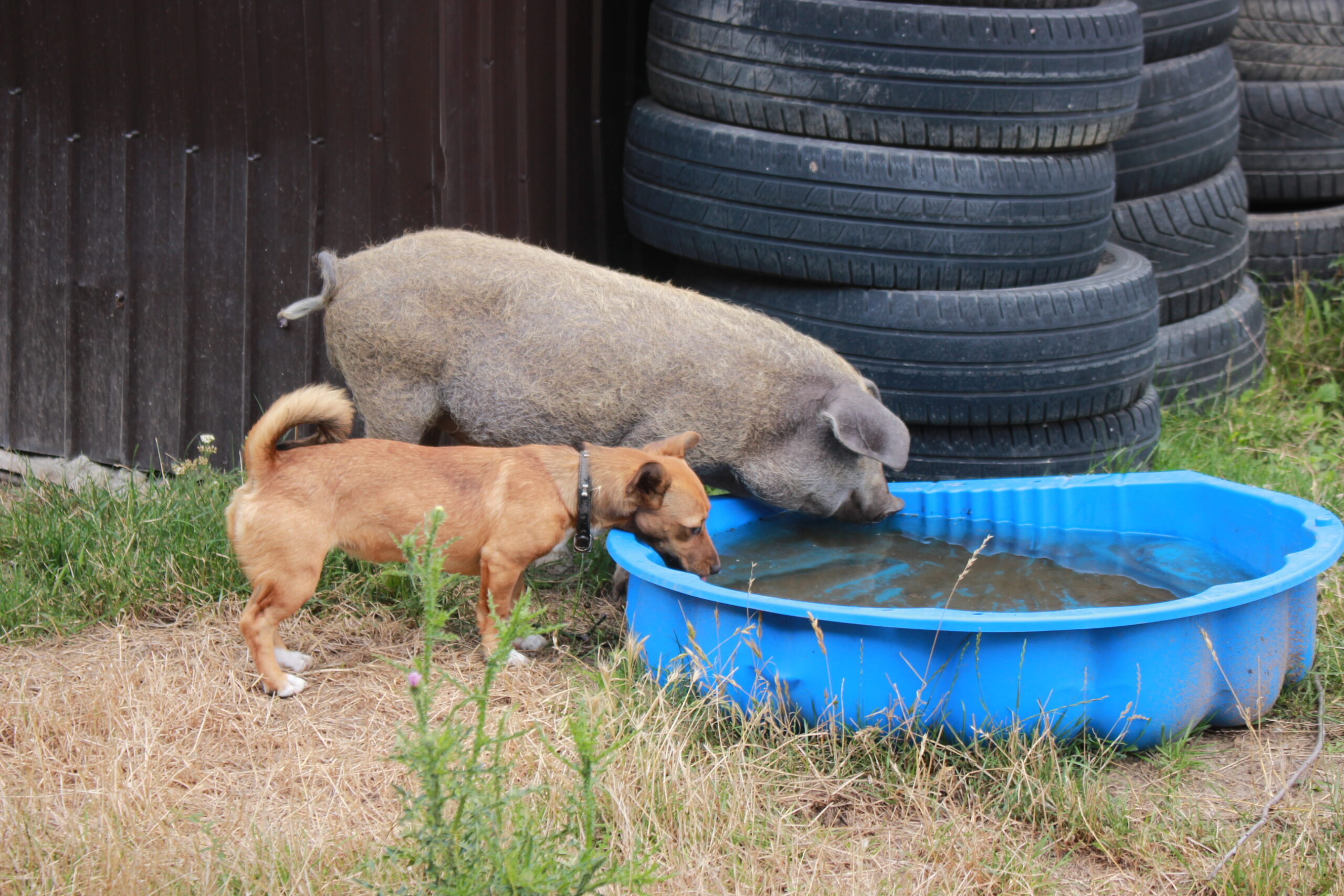 Am Abend habe ich mit Alex die Schafe noch eingesammelt und das kleine Ferkel der Familie nochmal flitzen lassen. Es sollte geschlachtet werden, so dass Mishu es mit ins Tierheim gebracht hat. Es ist eine ungarische Rasse mit sehr drahtigen kurzen Haaren…Sein bester Freund ist eine kleine Hündin, die zur Familie gehört… Beide spielen zusammen über die Wiesen, trinken aus dem kleinen Pool oder wühlen in der Erde. Eine spannende Kombination… Der kleine Ferkel Mann hört schon gut auf Zuruf, läuft brav hinterher und nimmt gerne ein paar Leckerchen entgegen – alles genau wie bei unseren Hunden. Doch unsere Hunde stehen Tag für Tag im Fokus, werden geliebt, umsorgt und geschätzt. Ein Ferkel ist eben auch in Deutschland nur ein Ferkel, was gemästet, transportiert und geschlachtet wird…. heute im direkten Kontakt mit diesem Schweinekind wurde mir mal wieder einmal mehr klar, wie absurd und paradox diese Nutztier-Haustier Geschichte ist. Aber solange es Tierschutzvereine gibt, die auf ihrem Sommerfest tierische Grillwürste verkaufen, wird diese Unterscheidung immer weiter existieren.
