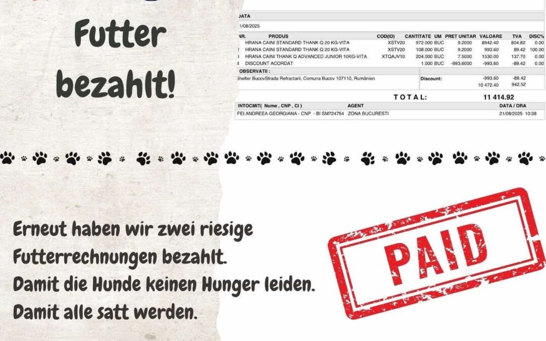 Unsere Hunde in RumĂ€nien brauchen tĂ€glich Berge an Futter Futter â und ohne dieses Futter haben sie keine Chance zu ĂŒberleben. Wir haben in den letzten Tagen zwei riesige Futterrechnungen beglichen, weil wir nicht zusehen konnten, wie unsere SchĂŒtzlinge hungrig bleiben. Doch jetzt stehen wir selbst am Limit. (Wir haben in Summe 17.000âŹ ĂŒberwiesen….) đ