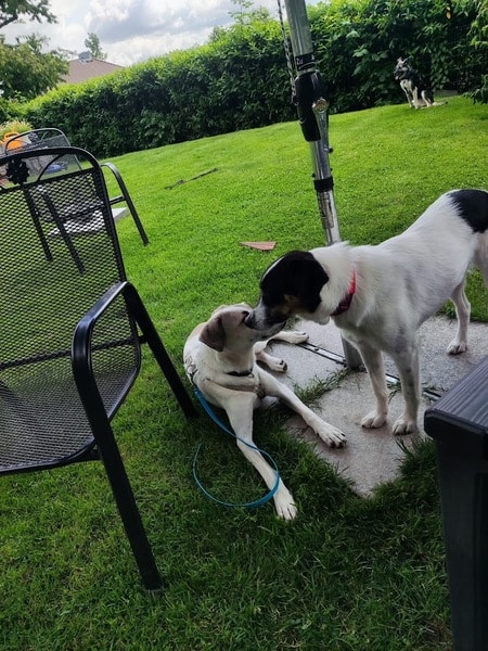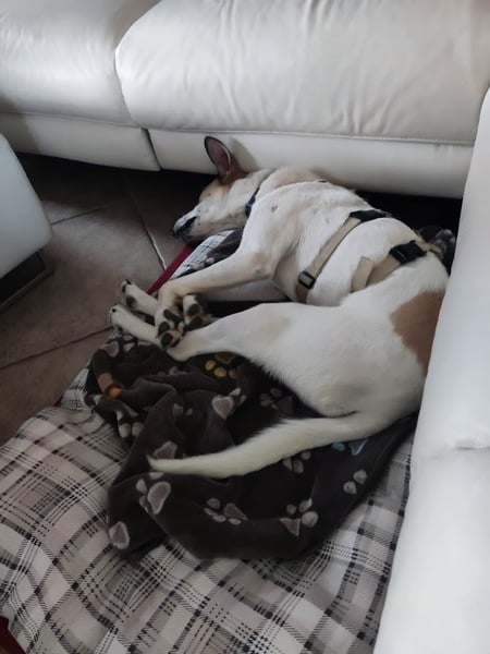 Mit dem Rudel ist sie auch absolut verträglich. Kein Gezanke, kein Resourcenverhalten, kein Futterneid. Fröhlich und lustig spielt sie die anderen Hunde an, freut sich, wenn die mitmachen. Ansagen bzw. Ablehnung versteht sie und zieht sich anstandslos zurück. Sie ist aufmerksam, verschmust, sanft und auch mal überquellend vor Freude. Im Haus kommt sie rasch zur Ruhe und legt sich einfach ab. Den ersten Home-Office Tag hat sie gut verschlafen und die erste Gassirunde hat sie prima mitgemacht; fast als wenn sie das schon immer getan hat. Sie läuft freudig mit, erspürt die Länge der Leine, nimmt ihre Umgebung aufmerksam war. Im Auto mitfahren hat sie ebenfalls problemlos gemeistert. Die hundeverständigen Katzen ignoriert sie bislang. Sie ist stubenrein, schläft nachts durch, ich kann ihr Dinge gefahrlos wieder abnehmen. Bett und Sofa sind hier tabu, auch hier scheint sie ein Vorzeigehund zu sein, und legt sich brav in die Körbchen oder bei Tisch einfach zu den Füßen hin.