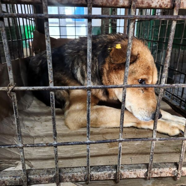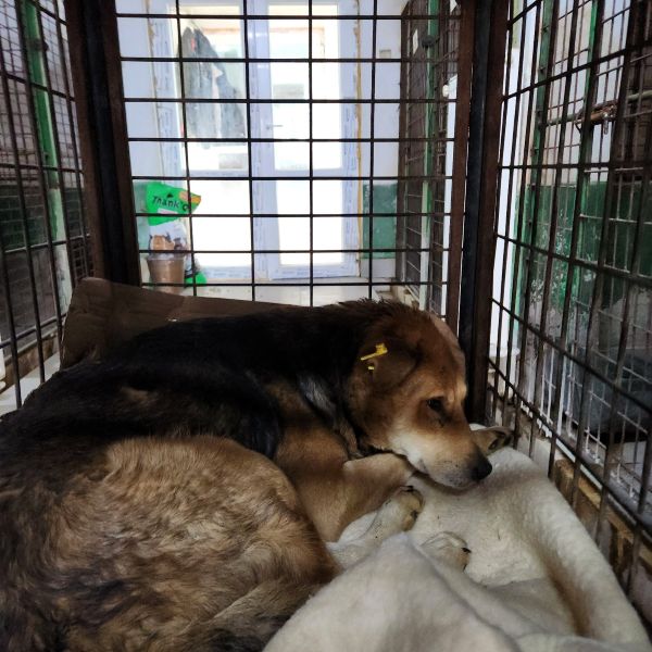 Da der Vetkennel allerdings aus allen Nähten platzt, fristet der arme Kerl nun sein Dasein in einem Transportwagen. Vermutlich das erste Mal in seinem Leben darf er sich in einer Decke einrollen. Der Ausdruck seiner Augen verrät, dass er fix und fertig ist und es scheint als würde sich der sensible Rüde nicht nur körperlich, sondern vor allem seelisch immer mehr aufgeben.
