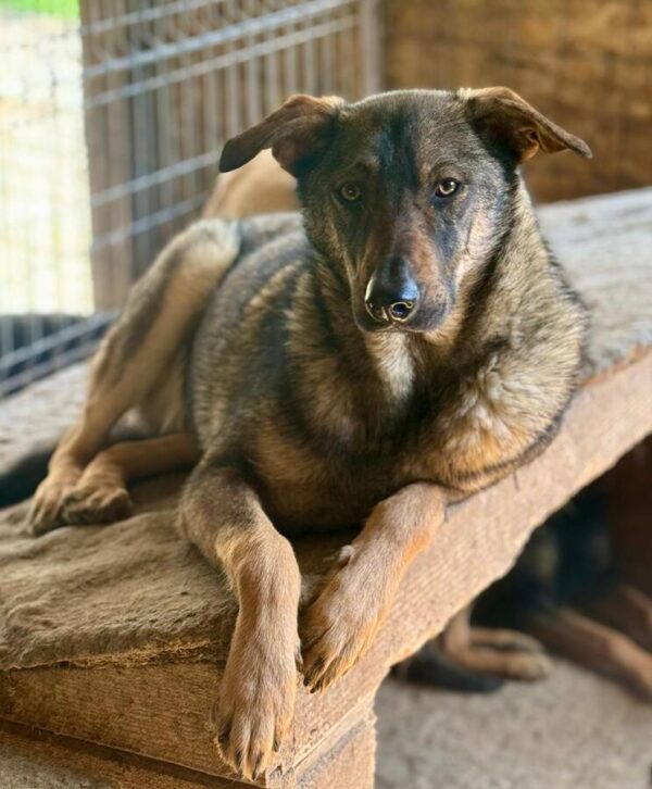 Unsicher liegt ANGUS auf seinem Hüttendach und beobachtet uns. Er weiß noch nicht so recht was er mit uns anfangen soll, deswegen bellt er erstmal. Nach kurzer Zeit lies er sich jedoch überall anfassen, konnte es aber noch nicht genießen. Er wünscht sich Menschen die seine Neugier erkennen und ihm Vertrauen schenken.
