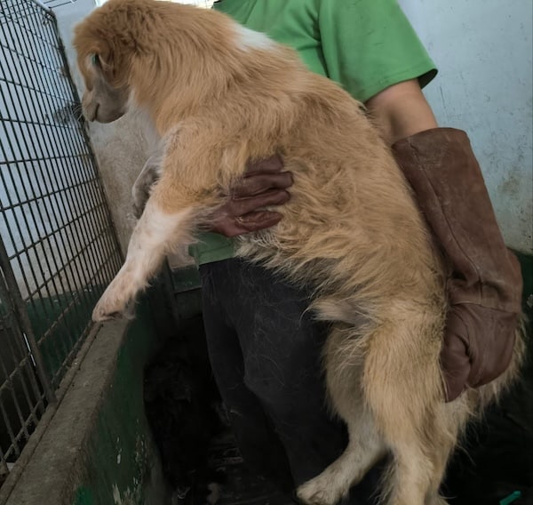 Als wir den engen Kennel betreten, kam er nicht aktiv auf uns zu. Unter leichter Bedrängung konnten wir ihn problemlos auf den Arm nehmen.