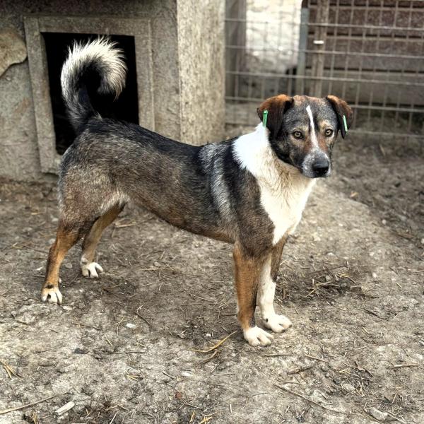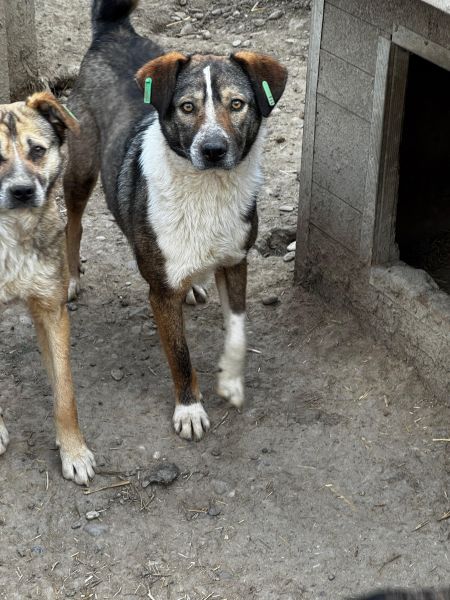 Dieser wunderschöne Rüde mit der außergewöhnlichen Gesichtszeichnung sitzt vermutlich mit seinen Geschwistern in einem vollen Junghundekennel. Er ist etwas zurückhaltend, aber neugierig und interessiert. Leckerchen nahm er aus der Hand. Anfassen konnten wir ihn nur ganz kurz an der Nase. Hier merkt man den fehlenden Menschenkontakt. Dennoch nahm er immer wieder selbständig Kontakt zu uns. Wir sind sicher, dass er in einer ruhigeren Umgebung schnell auftauen wird. Er lebt in einem gemischten Rudle und scheint dort verträglich.