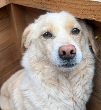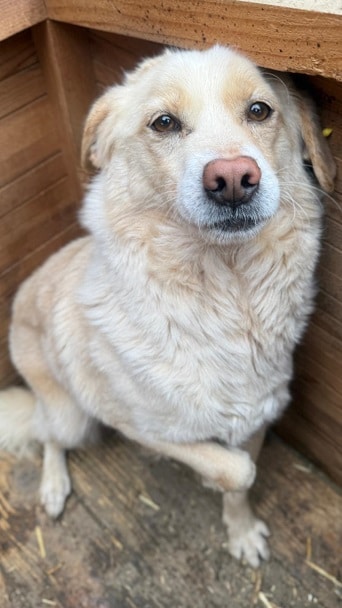 ARTJOM begrüßte uns neugierig und war sehr an uns interessiert. Endlich einmal Abwechslung! Aber so ganz in unsere direkte Nähe traute er sich leider nicht. Leckerli fraß er gern vom Boden und auf dem Hüttendach, direkt aus unserer Hand nahm er sie nicht. Als wir ihn bedrängten, konnten wir ihn gut streicheln und auf den Arm nehmen. ARTJOM zeigte hierbei weder Abwehr – noch Fluchtverhalten. Ein ganz toller Kerl, der den menschlichen Kontakt einfach nicht gewohnt ist. In einer anderen Umgebung würde ARTJOM vermutlich in wenigen Tagen zutraulicher werden.
