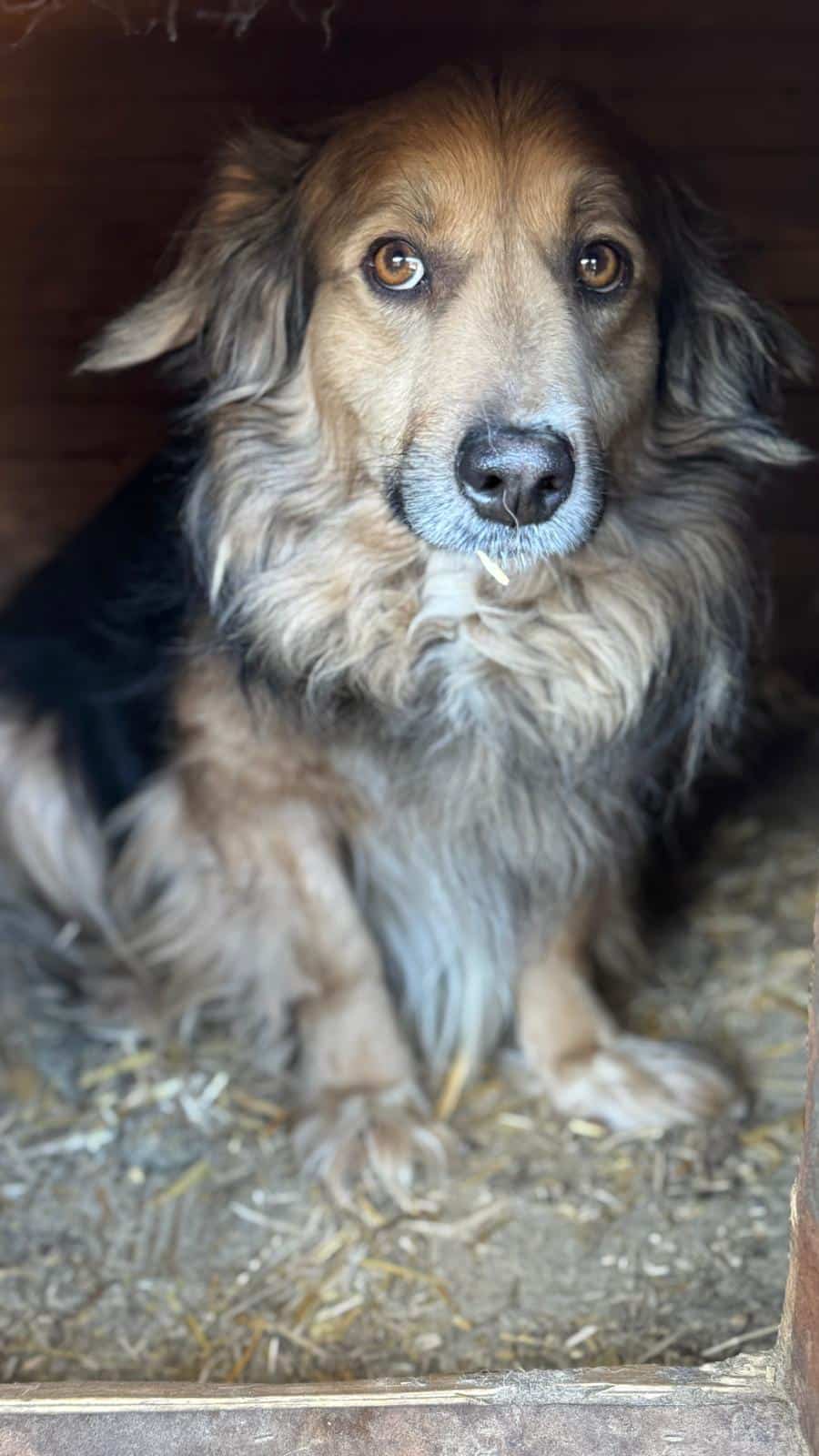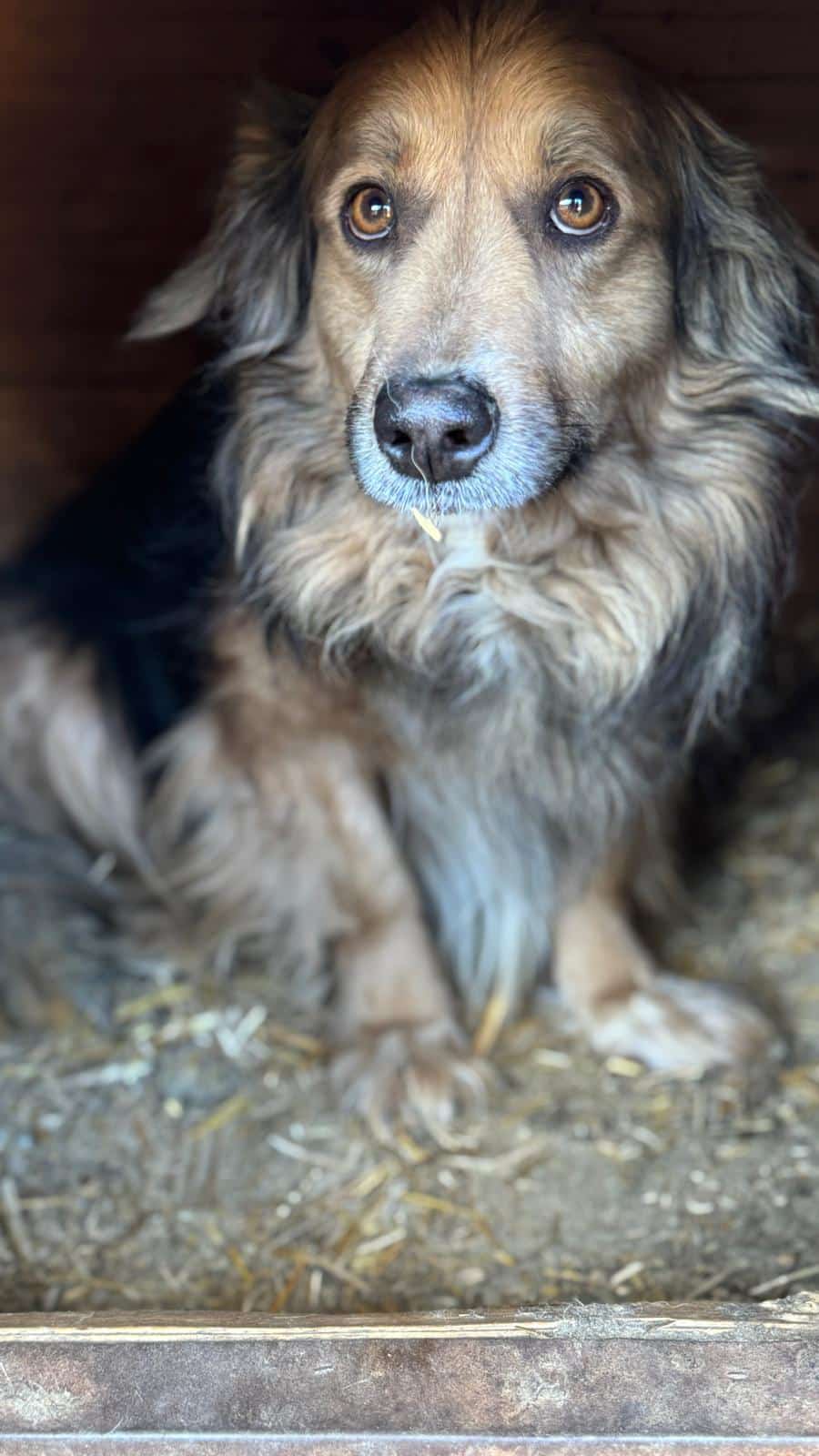 ASHANTI lag in der Hütte und beobachtete, was wir im Kennel so treiben. Bei Kontaktaufnahme war er im ersten Moment etwas verunsichert. Als wir ASHANTI dann aber Leckerlis anboten, nahm er diese gerne aus der Hand.