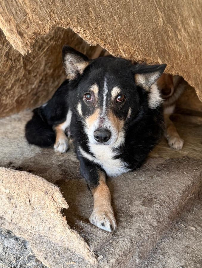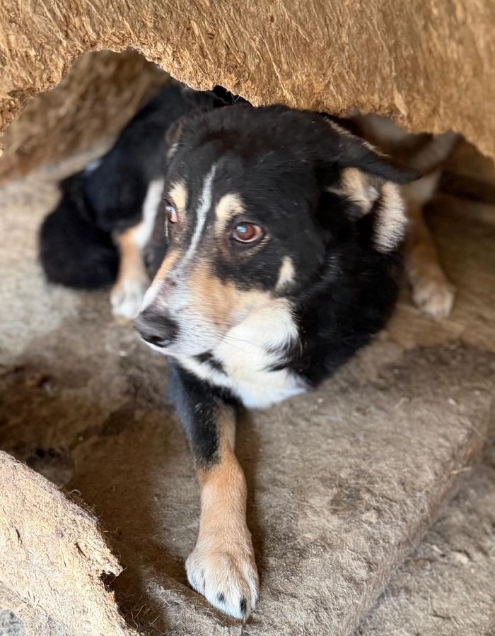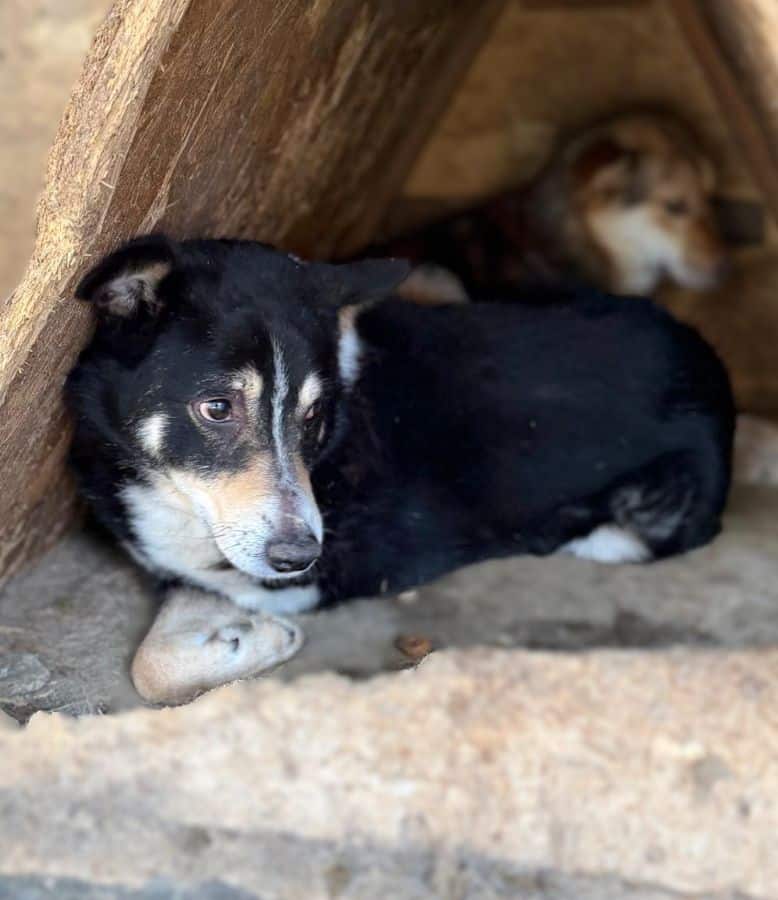 Unser Dreibeinchen AVANI ist inzwischen in einen Außenkennel umgezogen. Bei unserem Besuch lag er in seiner Hütte und zeigte sich dabei durchaus neugierig und interessiert. Auf vorsichtige Berührungen reagierte er noch etwas unsicher, blieb jedoch ruhig und defensiv liegen. Menschliche Nähe ist für ihn noch ungewohnt, aber er lässt alles geduldig über sich ergehen.