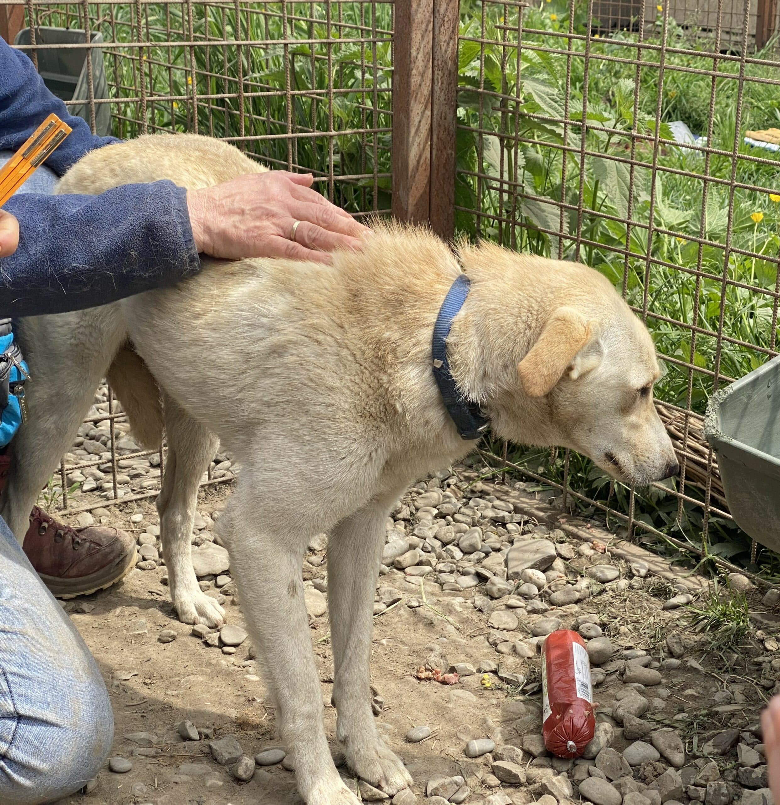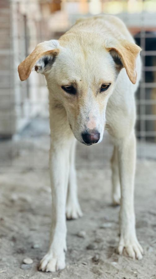 Diese junge Hündin ist neu im Shelter und lebt mit zwei ebenfalls neuen und etwas scheuen Hunden zusammen im Kennel. Alle drei Hunde sind mit der Situation überfordert. Sie hatte wahrscheinlich mal einen Besitzer, da sie ein Halsband trägt. Sie nimmt Leckerlie aus Entfernung vom Boden, aus der Hand hat sie sich das nicht getraut. Unter Bedrängung ist sie überall anfassbar und zeigt kein Abschnappverhalten.