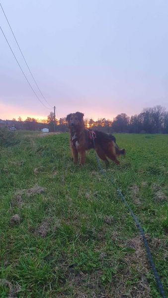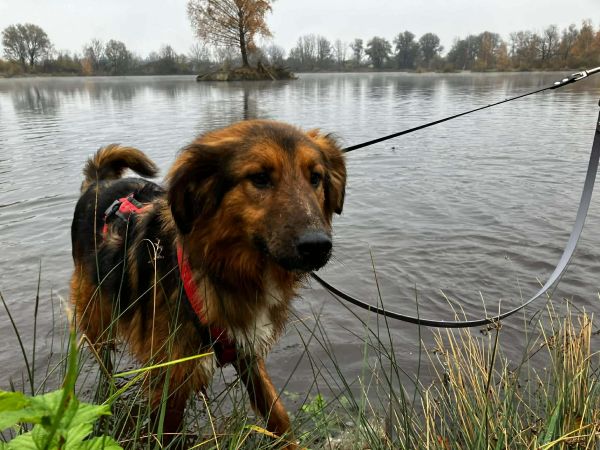 Er geht gerne Gassi, auch längere Runden bereiten ihm große Freude, ebenso wie Waten durch Wassergräben und Bäche, nicht nur im Sommer. Er läuft schon gut an der Leine, ist draußen entspannt und wenig schreckhaft. Gerne erkundet er neue Umgebungen und ist sehr neugierig. Hundebegegnungen sind dabei für ihn kein Problem, er ist freundlich und vorsichtig interessiert.