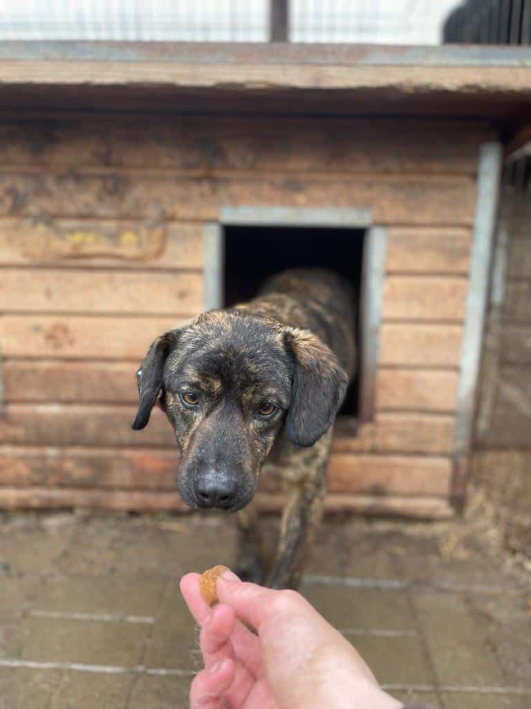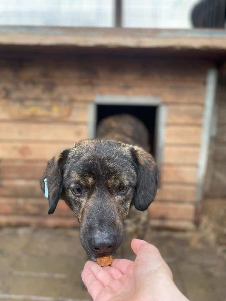 Der süße BANDIT ist weiterhin vorsichtig und eher zurückhaltend, nahm aber gern unsere Leckerchen aus der Hand. Wir konnten ihn bereits vorsichtig an der Schnauze berühren.