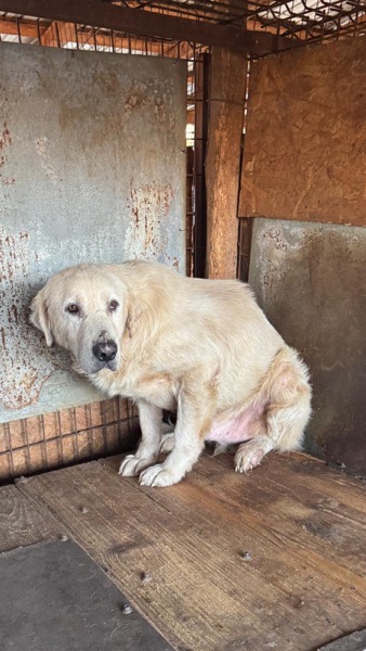 BIANCO ist ein lieber, noch unsicherer Rüde. Der Herdenschutzhund(-mix) ist eine eigentliche imposante Erscheinung, der auf uns aber einen sehr traurigen Eindruck machte, weil er mit gesenktem Kopf auf der Hütte saß. BIANCO wich bei Berührungsversuchen zunächst zurück, ließ sich aber gut anfassen. Unsere Leckerlies wollte er nicht annehmen. Wir haben ihn zunächst älter geschätzt, weil er einen schlechten Eindruck macht und körperlich abgekämpft wirkt, seine Zähne sind aber relativ gut, weswegen wir denken, dass er wahrscheinlich noch gar nicht so alt ist. BIANCO ging gebückt, was aber auch an seiner Unsicherheit gelegen haben kann. Sein Rute ist leider verfilzt. Mit den anderen Hunden in seinem Kennel wirkte BIANCO verträglich. Wir wünschen uns für den lieben BIANCO ein herdenschutzhunderfahrenes Zuhause.