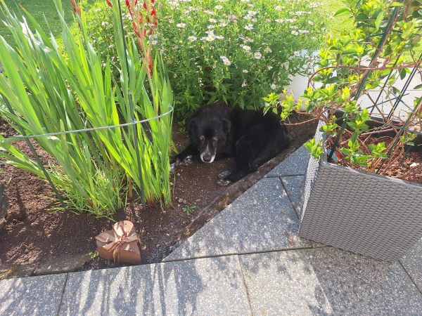 Anfangs war er eingeschüchtert, hat sich aber in null Komma nichts ins Rudel integriert. Er orientiert sich sehr an unseren Hunden. Geschätzt wird er auf 12 – 14 Jahre. Im Kopf noch total fit und an allem interessiert.