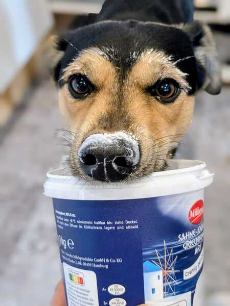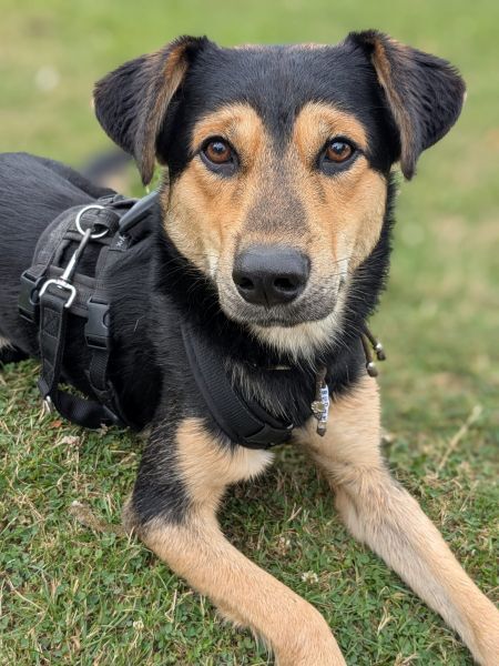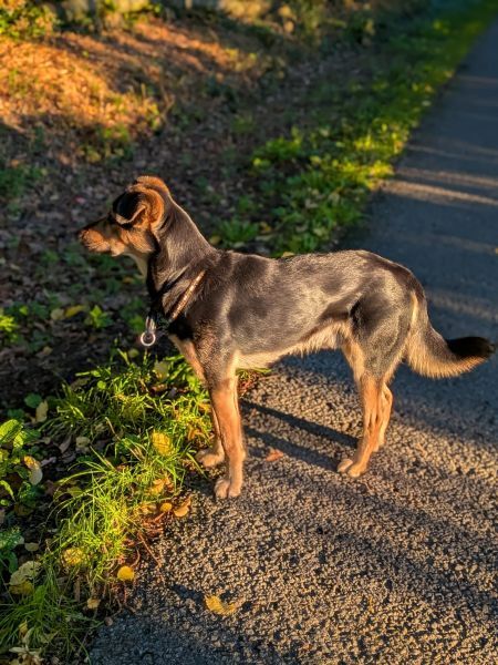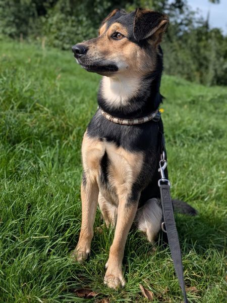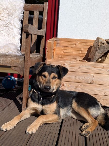 Der junge Rüde ist ein kleiner Sonnenschein, der sein Frauchen überall hinbegleitet und sich bisher in allen Situationen angstfrei und mutig gezeigt hat. Er geht gerne schwimmen, war schon mit im Campingurlaub, läuft am Fahrrad oder neben den Inlinern mit und schläft entspannt, während Frauchen im Homeoffice arbeitet. Er bleibt gut stundenweise allein Zuhause.