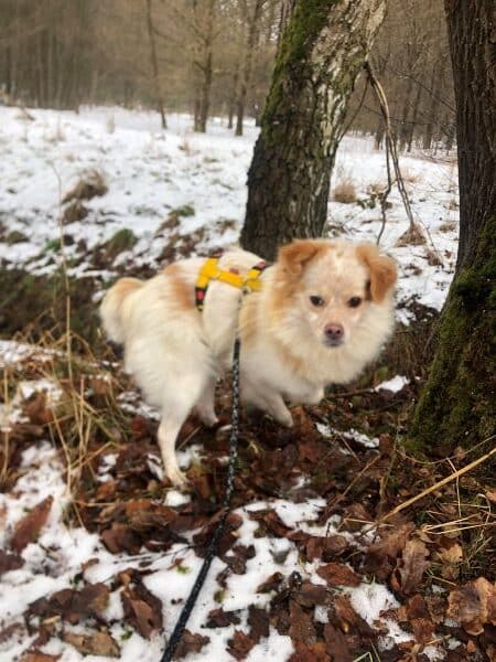 Button lernt sehr fix, bereits nach einer Woche reagierte er auf seinen Namen. Er war sofort stubenrein, also das Leben im Haus scheint er zu kennen, allerdings kennt er das Leben draußen wenig bis gar nicht. Alles ist interessant, egal ob ein parkendes Auto, eine Mülltonne, selbst ein Baum im Wald. In solchen Momenten ist er oft auch schwer ansprechbar. Wir üben im Moment immer auf demselben Weg, aber auch da sind natürlich jeden Tag andere Gerüche und Eindrücke. Hier funktioniert der Rückruf schon recht gut (natürlich an der Schleppleine mit Leckerlis).