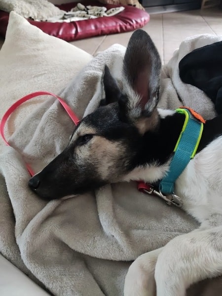 Ihr schlanker Körper mit den langen Beinen und überaus entzückenden Riesenohren lassen vermuten, dass ein wenig Galgo / Windhund in ihr steckt. Das würde bedeuten, dass Caara noch einen ordentlichen Schub an Größe machen kann. Genau wissen wir es natürlich nicht, sollte aber mit eingeplant werden. Umso mehr Kuschelfläche hat man später – denn das ist Pflicht. Sie genießt es, zusammen Zeit zu verbringen und lässt sich genüsslich das seidige Fell, das weiche Bäuchlein kraulen. Bett, Sofa und Katzenfutter sind hier tabu – klappt (meistens) auch schon ganz gut.
