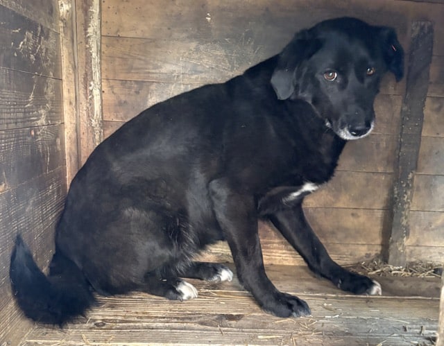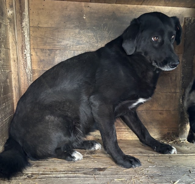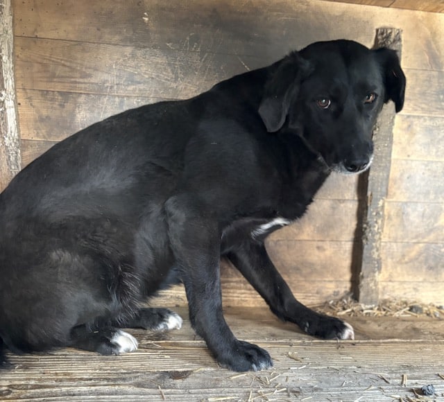 Die hübsche Hündin saß in der Hütte und wusste mit unserem Besuch nicht richtig etwas anzufangen. In der Hütte fühlte sie sich sicher und war dort auch vorsichtig anfassbar. Ganz geheuer war es ihr nicht, sie flüchtete aber auch nicht vor uns.