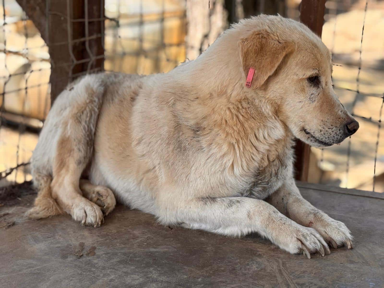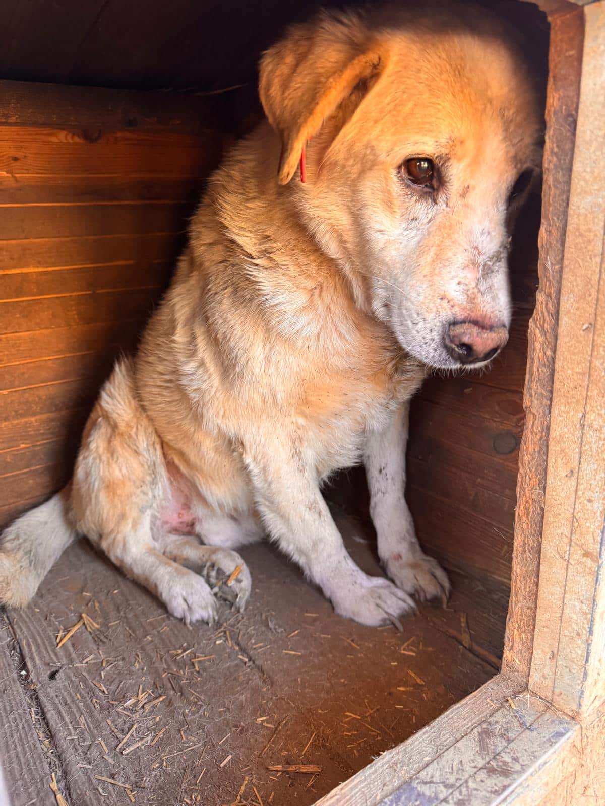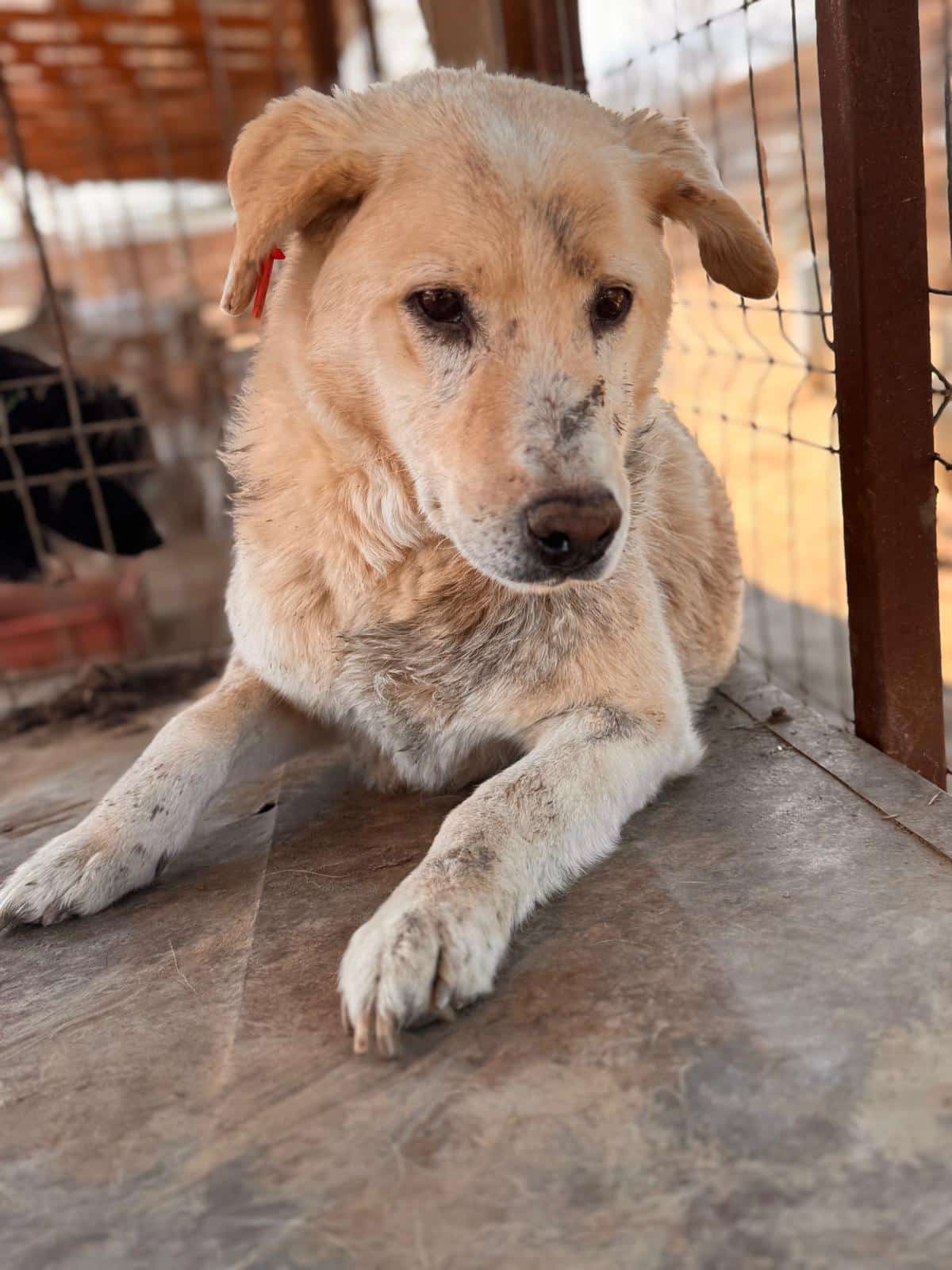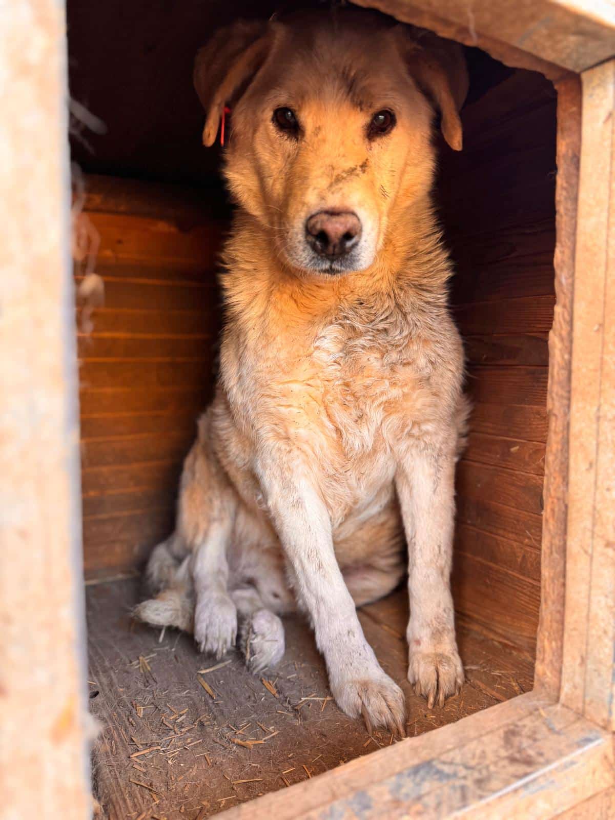 CAMELLO machte bei unserem Besuch einen abgekämpften und traurigen Eindruck auf uns. Er lag zunächst nur in der Hütte und nahm dort unsere Leckerlies, wenn wir sie ihm hingelegt haben. Er ist uns Menschen gegenüber weiterhin unsicher und wir konnten ihn leider nicht anfassen. Sein Fell ist total verschmutzt und er wirkt müde und resigniert. CAMELLO belastet beim Laufen sein rechtes Hinterbein nicht richtig, aber hat es noch geschafft, auf eine Hütte zu springen.