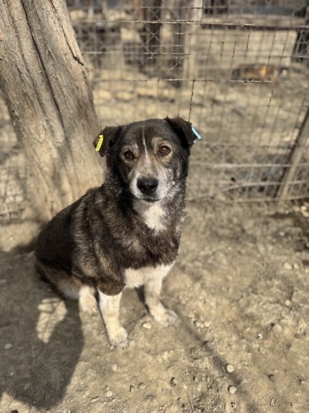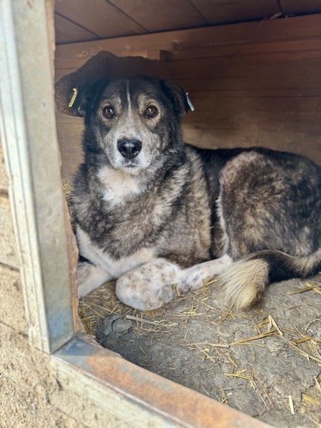 Diese wunderschöne Hündin saß zunächst nur in der Hütte und beobachtete uns. Als wir uns ihr zuwandten, siegte ihr Neugier und sie kam aus der Hütte heraus. Ruhig nahm sie unsere Leckerchen aus der Hand. Anfassen konnten wir sie dabei jedoch noch nicht. Sie lebt in einem gemischten Rudel und scheint dort verträglich.