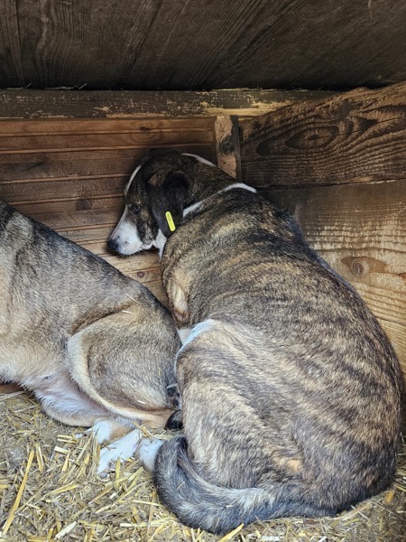 Leider ist die noch recht junge Hündin aufgrund fehlenden Menschenkontaktes scheu. Sie wich immer aus und suchte entweder Schutz zwischen ihren Kumpels oder in einer Hütte. Aus der Hütte war sie stets so schnell wieder raus, dass wir auch ein Anfassen unter Bedrängung nicht testen konnten. Wir haben sie daher kein Mal angefasst. Sie ist verträglich.