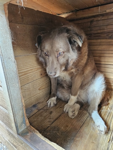 Die hübsche CHANA wollte während unseres Besuchs nicht aus der Hütte kommen. Sie ist nach wir vor zu dick und an Po und Rute machen sich deutliche Hautprobleme durch kahler Stellen bemerkbar. Auch wenn sie mit uns keinen Kontakt suchte, so ließ sie sich in der Hütte dennoch gut von uns streicheln. Die angebotenen Leckerchen nahm sie anfangs nur vom Boden, mit etwas Überzeugungsarbeit dann aber auch vorsichtig aus der Hand.
