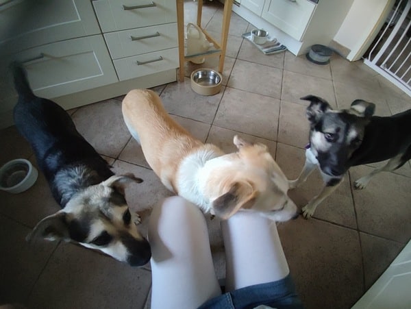 Zum spielen im Garten ist er noch nicht bereit; da beobachtet er lieber und holt sich Rückendeckung beim Pflegefrauchen. Das wird bestimmt mit der Zeit auch noch kommen. Genau wie das Bellen; aktuell haben wir das noch nicht hören können. Er lebt hier als Hahn im Korb im Hündinnenrudel und kommt damit sehr gut klar. Mit seinem sanften Wesen und kajalumrandeten Augen passt er wunderbar in die Mädelstruppe.