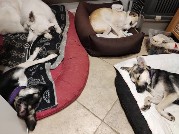 Im Haus ist er ein absolut ruhiger Begleiter; er legt sich ab und döst, wartet bis es wieder Zeit wird, aktiv zu werden. Eine gute Voraussetzung für z.B. Begleitung ins Büro oder Home Office. Er ist katzenverträglich, stubenrein, schläft nachts durch (sogar eher Langschläfer), markiert weder im Garten noch auf der Gassirunde, kann eine angemessene Zeit alleine bleiben, macht nichts kaputt (einzige Ausnahme: sein Geschirr – das findet er überflüssig), dekoriert nichts um, ist nicht futterneidisch, ich kann ihm jederzeit Dinge wieder abnehmen. Ich kann Chusu überall anfassen, Krallen schneiden, bürsten, hochheben. Beim Tierarzt wurde ihm etwas Zahnstein entfernt; auch das hat er sehr lieb über sich ergehen lassen. Bett, Sofa und Katzenfutter sind hier tabu und überhaupt kein Thema für Chusu.