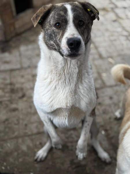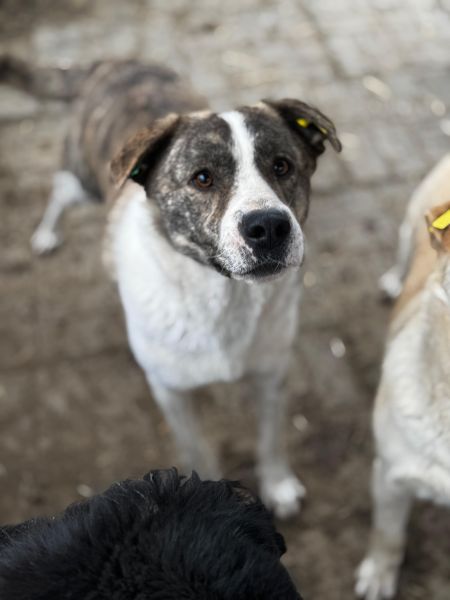 Dieser hübsche Rüde beobachte uns die ganze Zeit neugierig und interessiert aus der 2. Reihe was wir wohl so in seinem Kennel treiben. Er nahm gern unserer Leckerli aus der Hand, aber wenn man ihn streicheln wollte wich er zurück. Mit seinen Kollegen ist er verträglich und mit etwas mehr Zeit und Geduld, kann man ihn zu mehr bewegen.
