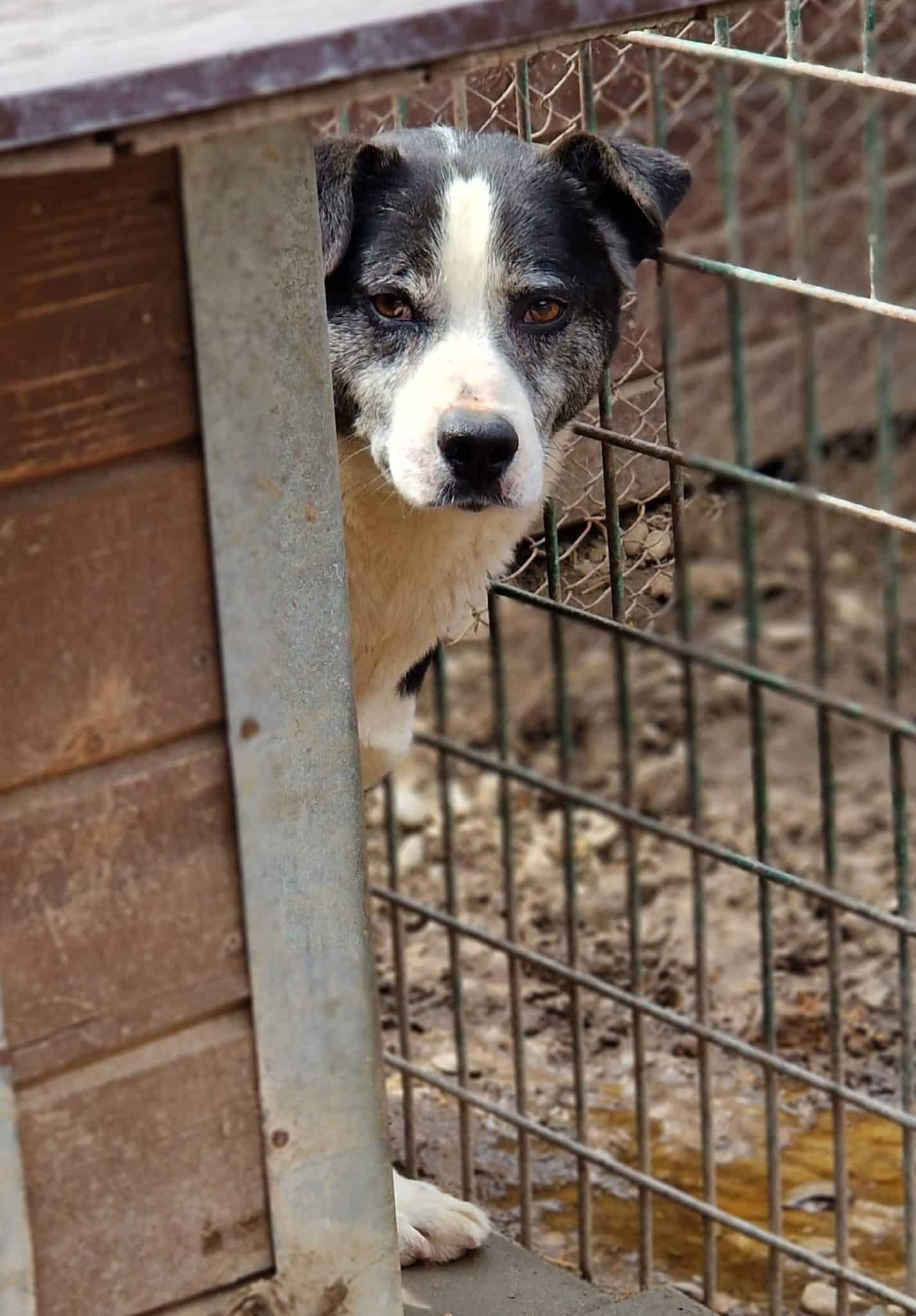 CORNEL verzog sich bei unserem Anblick wieder hinter den Schutz seiner Hütte und lugte neugierig hervor. Als wir ihm Leckerchen hinwarfen, traute er sich nicht so recht diese einzusammeln. Um das Eis zu brechen bräuchte der Rüde Zeit und Geduld, da er die Nähe des Menschen leider nicht gewohnt ist.
