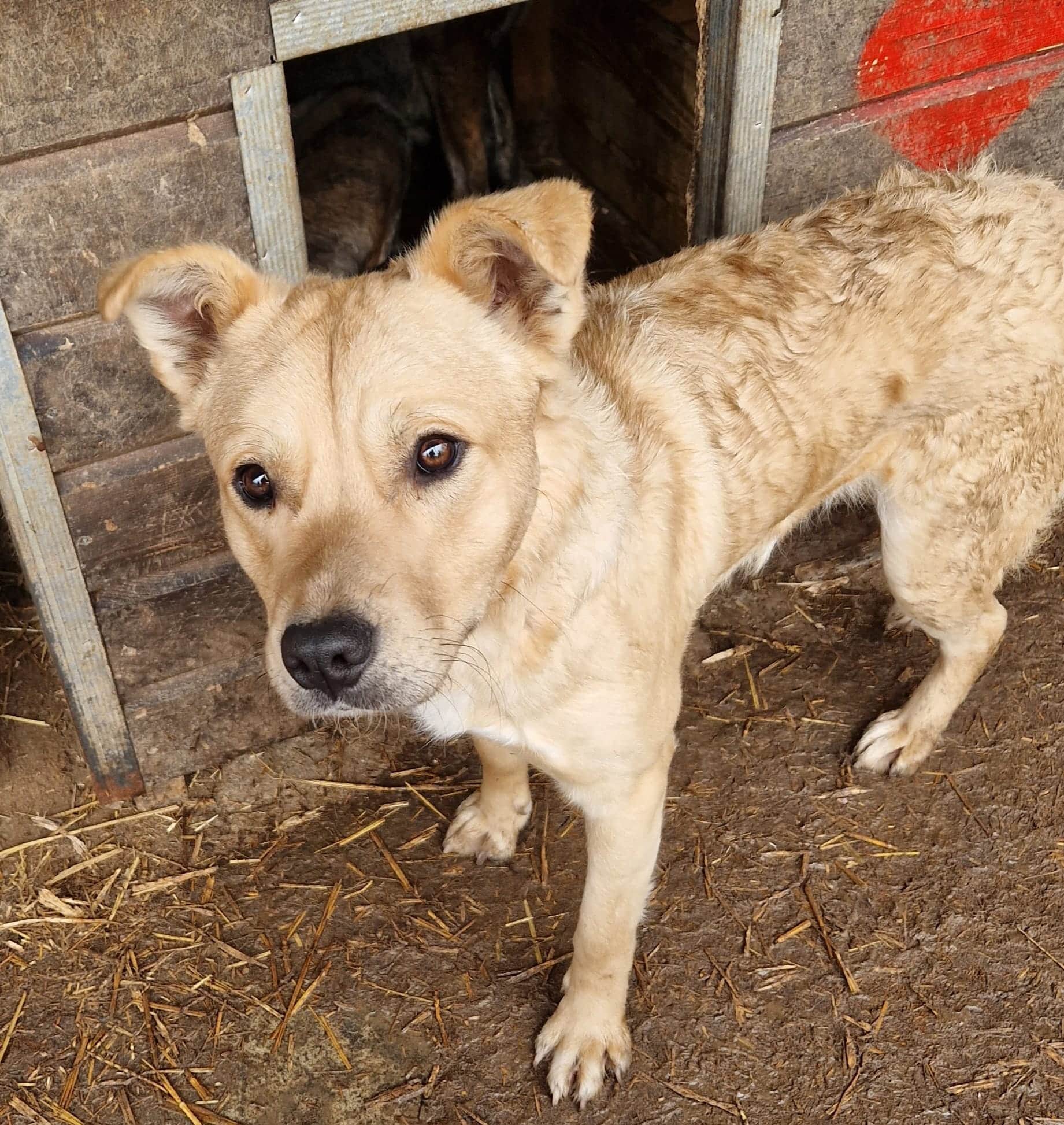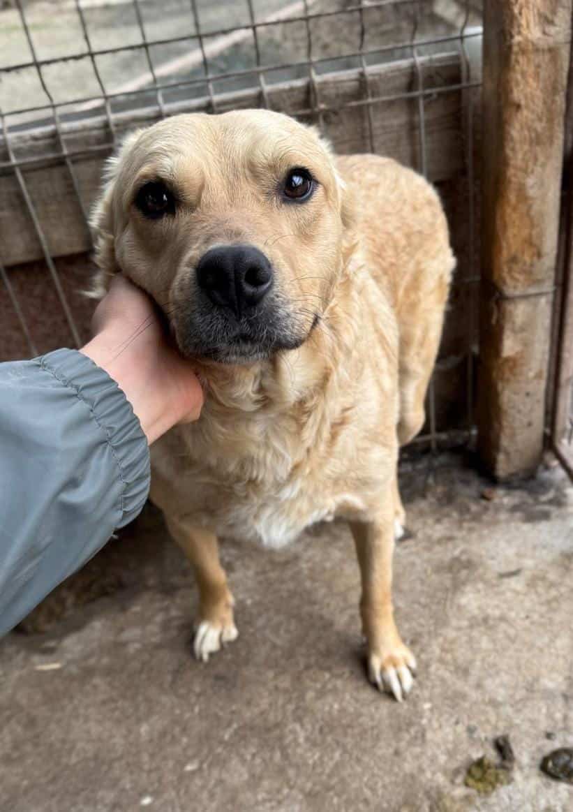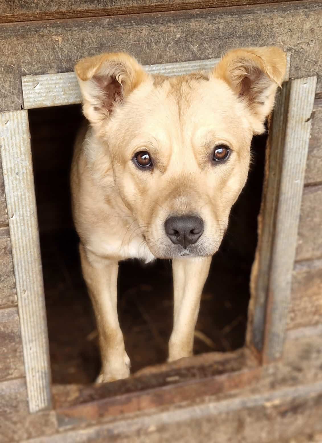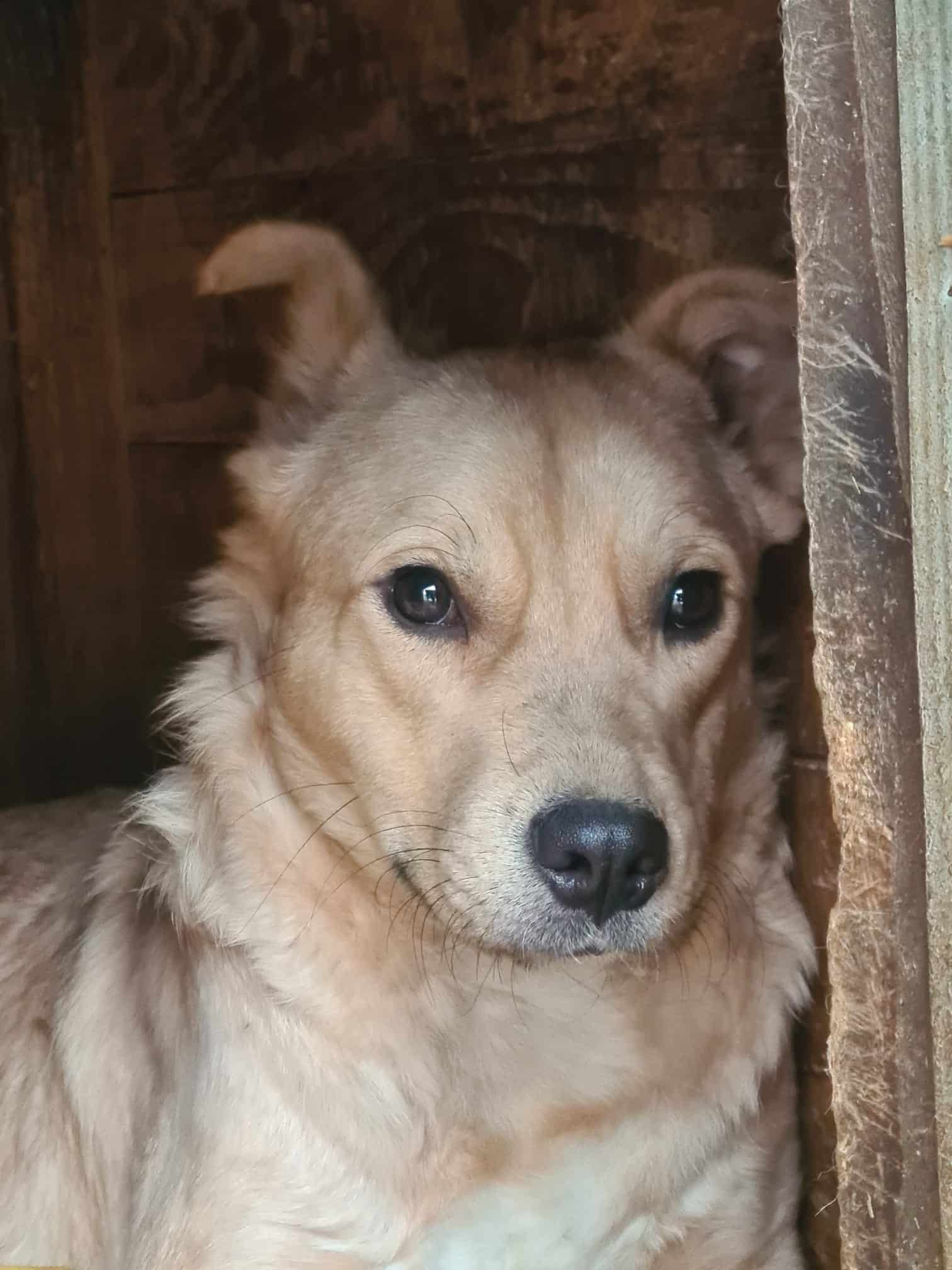 Er saß anfangs nur in der Hütte, als wir uns mit den anderen Hunden beschäftigten. Neugierig schaute er zwar zu uns, aber er war zu schüchtern, um rauszukommen. Als wir uns ihm zuwandten, wedelte DARO mit seiner Rute und freute sich über die Aufmerksamkeit. Er ist zwar etwas unsicher, aber man merkt ihm an, dass er Kontakt zu Menschen möchte. Er ist ein freundlicher junger Rüde, der nur noch nicht weiß, wie er sich verhalten soll. Er nahm mit etwas Zeit Futter zaghaft aus der Hand und kam dann auch aus seiner Hütte. Mit etwas Zeit zum Vertrauensaufbau wird er sich noch gut entwickeln, sollte aber nun wirklich dringend ausreisen.