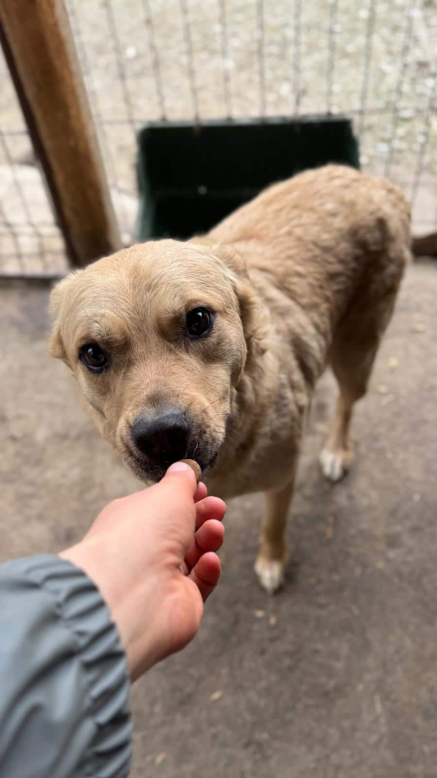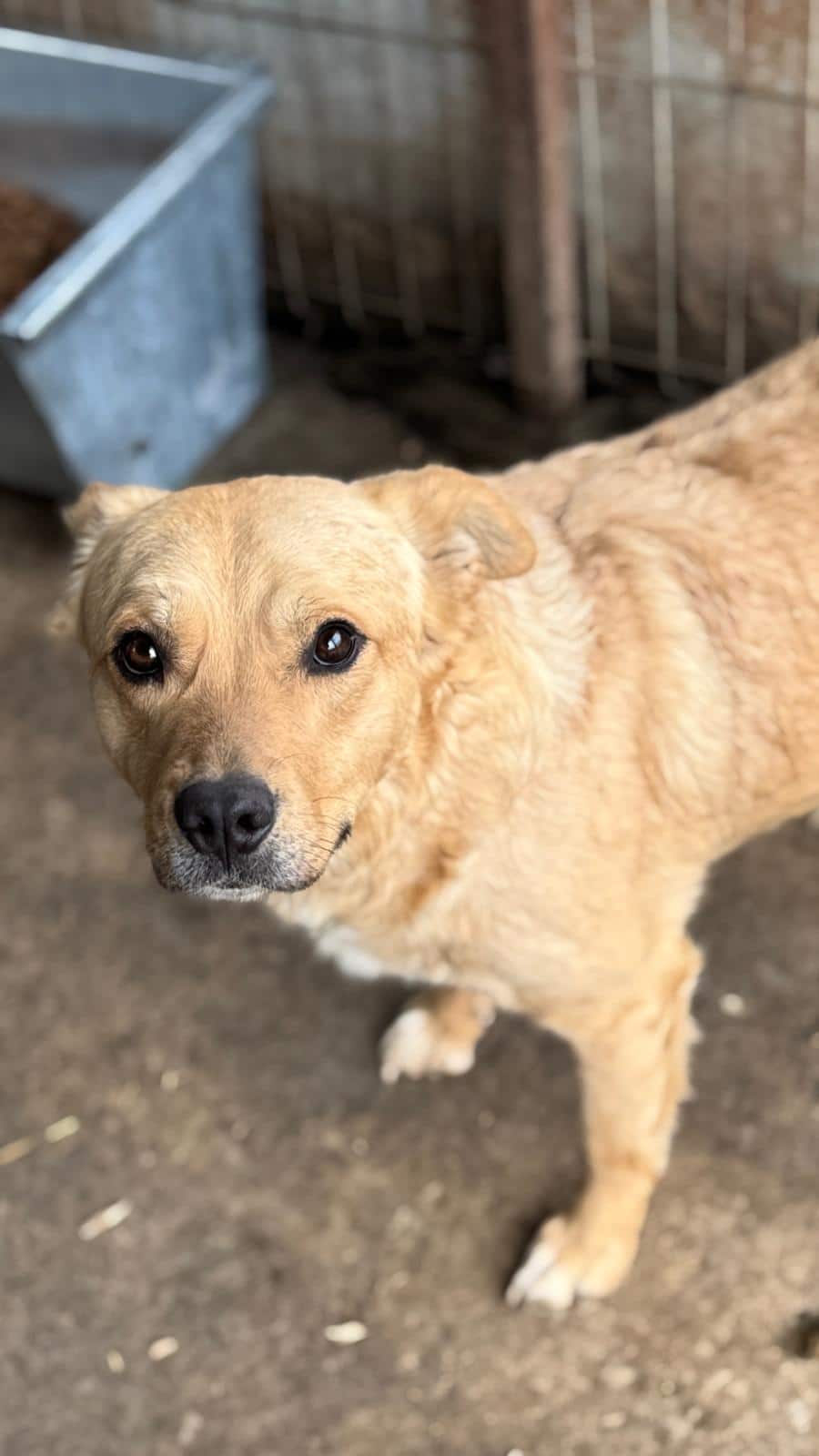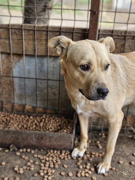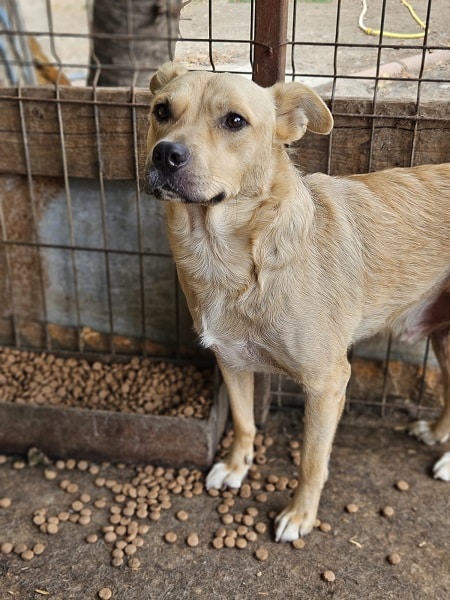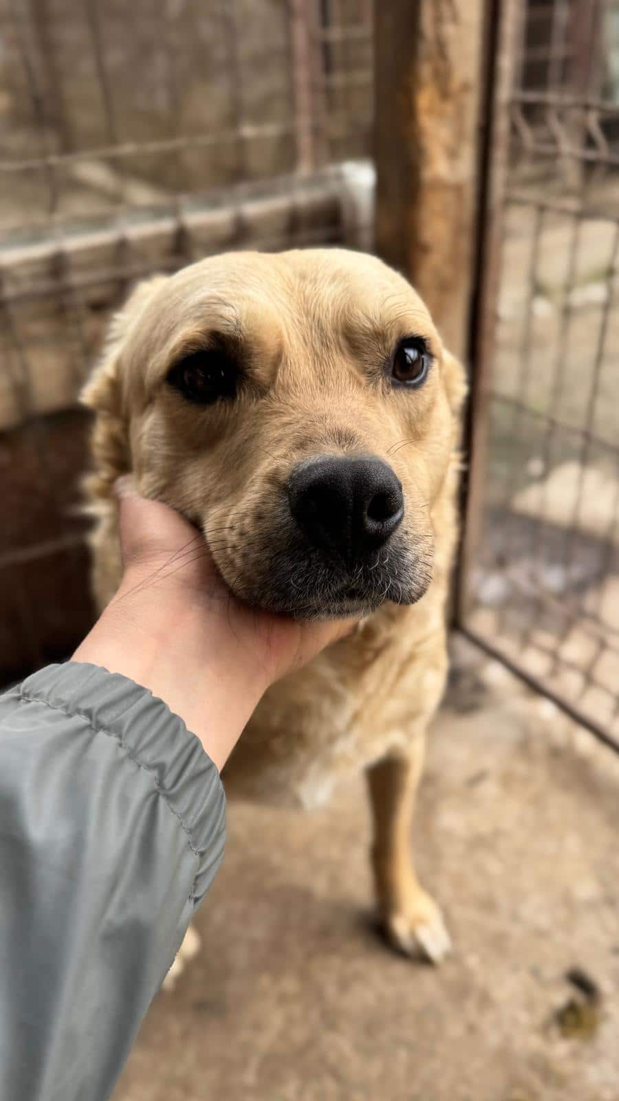 Er saß anfangs nur in der Hütte, als wir uns mit den anderen Hunden beschäftigten. Neugierig schaute er zwar zu uns, aber er war zu schüchtern, um rauszukommen. Als wir uns ihm zuwandten, wedelte DARO mit seiner Rute und freute sich über die Aufmerksamkeit. Er ist zwar etwas unsicher, aber man merkt ihm an, dass er Kontakt zu Menschen möchte. Er ist ein freundlicher junger Rüde, der nur noch nicht weiß, wie er sich verhalten soll. Er nahm mit etwas Zeit Futter zaghaft aus der Hand und kam dann auch aus seiner Hütte. Mit etwas Zeit zum Vertrauensaufbau wird er sich noch gut entwickeln, sollte aber nun wirklich dringend ausreisen.