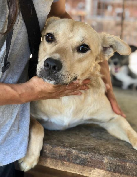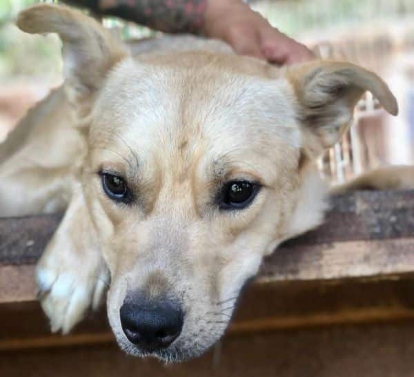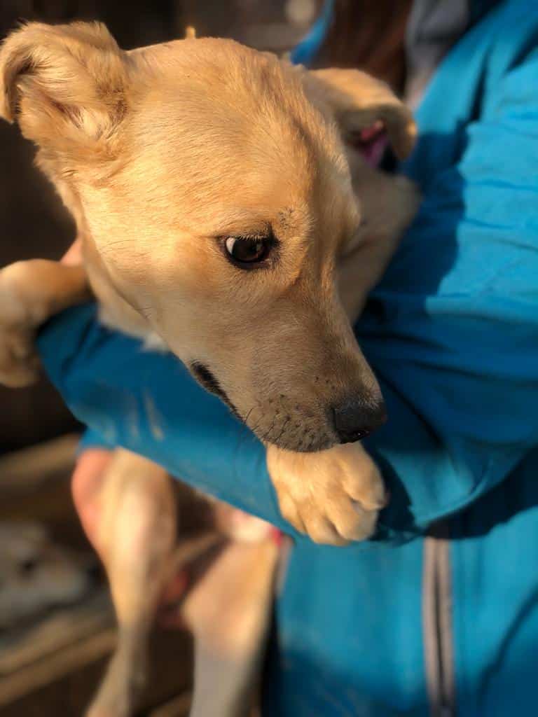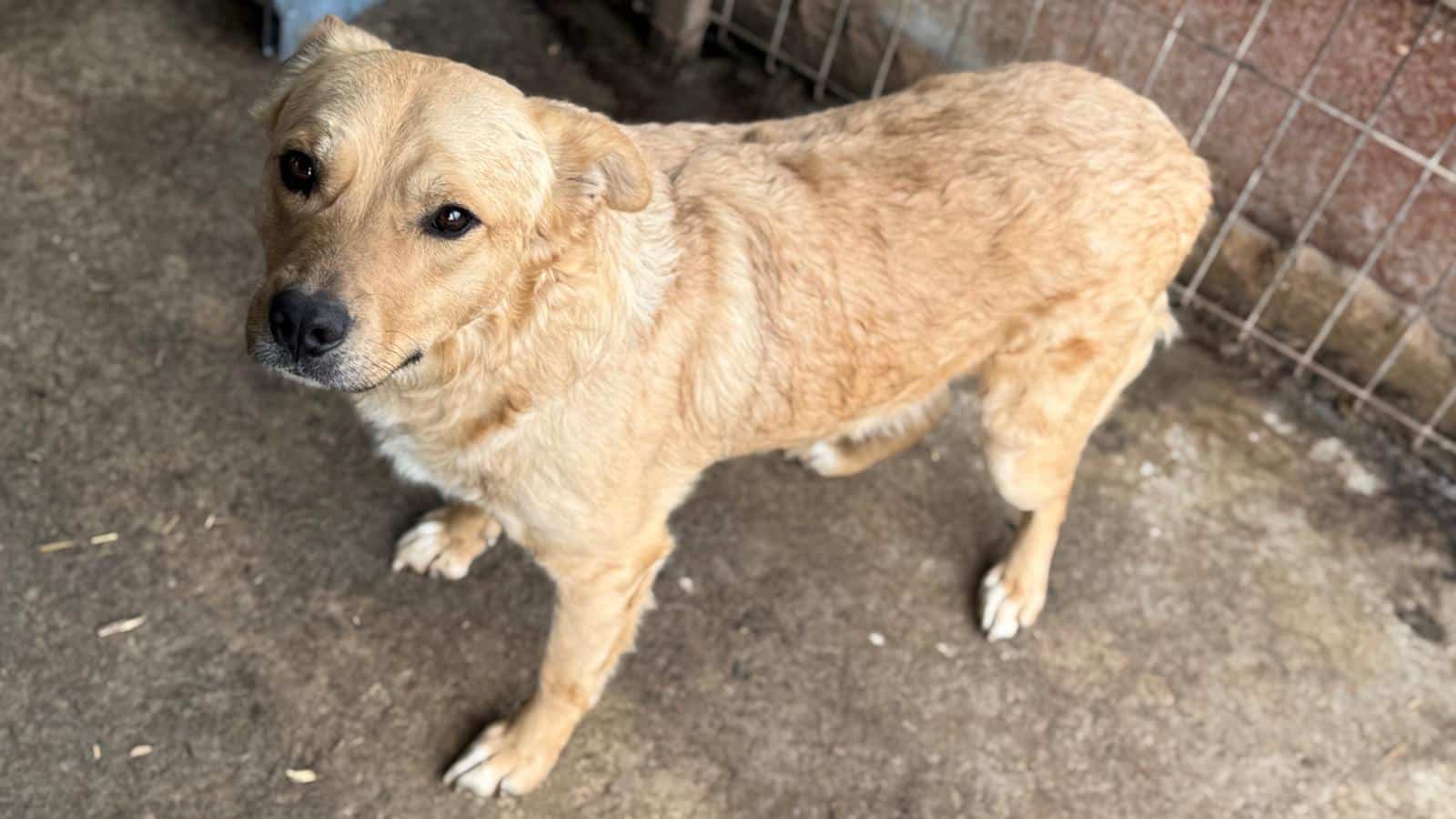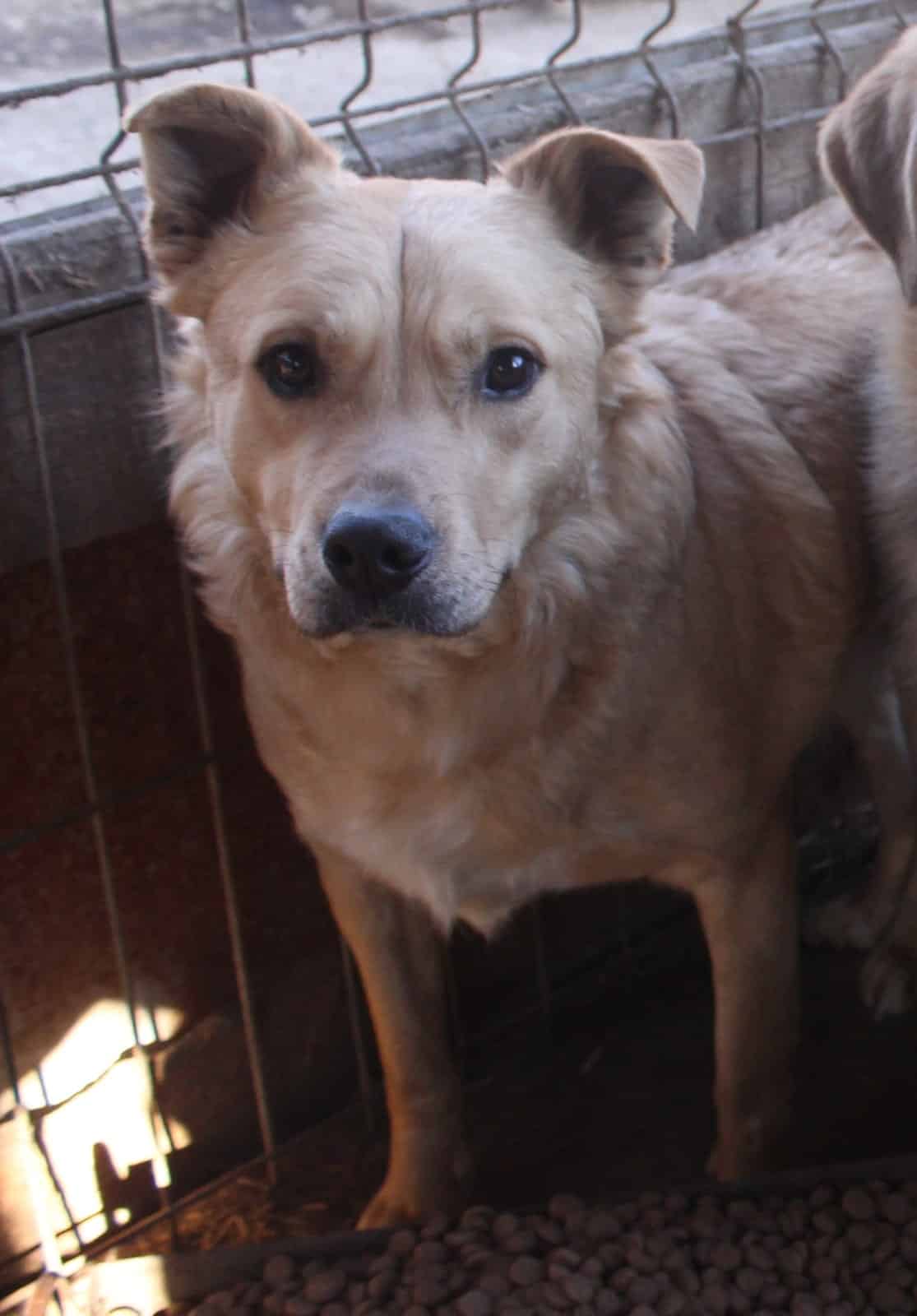 Er saß anfangs nur in der Hütte, als wir uns mit den anderen Hunden beschäftigten. Neugierig schaute er zwar zu uns, aber er war zu schüchtern, um rauszukommen. Als wir uns ihm zuwandten, wedelte DARO mit seiner Rute und freute sich über die Aufmerksamkeit. Er ist zwar etwas unsicher, aber man merkt ihm an, dass er Kontakt zu Menschen möchte. Er ist ein freundlicher junger Rüde, der nur noch nicht weiß, wie er sich verhalten soll. Er nahm mit etwas Zeit Futter zaghaft aus der Hand und kam dann auch aus seiner Hütte. Mit etwas Zeit zum Vertrauensaufbau wird er sich noch gut entwickeln, sollte aber nun wirklich dringend ausreisen.