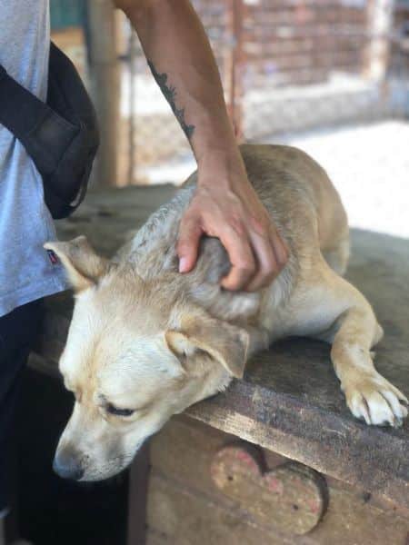 DARO sitzt inzwischen in einem Kennel mit ausschließlich unsicheren Hunden. So zeigte auch er sich bei unserem Besuch unsicher und wich uns aus. Wir konnten ihn unter Bedrängung dennoch gut anfassen und er zeigte keinerlei Abwehrverhalten. Von alleine hätte er sich diesmal wohl aber nicht zu uns getraut. Sein rechtes Hinterbein schont er weiterhin. Leider ist er aktuell durch den Bewegungsmangel (er sitzt seit langer Zeit nur in winzigen Kennels) auch zu dick, wodurch seine 3 gesunden Beine noch mehr belastet werden. Es wird wirklich Zeit, dass DARO endlich aus dem Shelter kommt.
