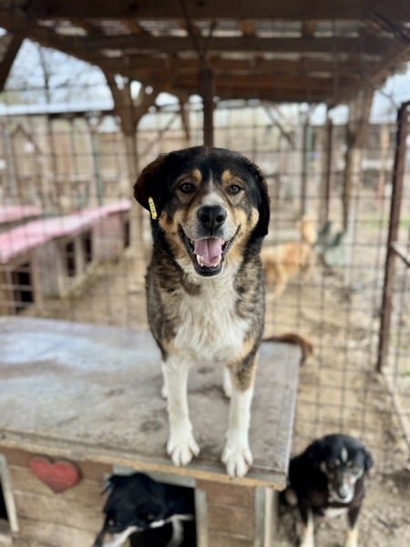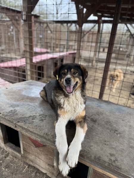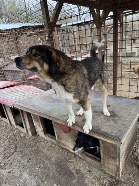 Für DA VINCI war unser Besuch eine willkommene Abwechslung im sonst so harten und tristen Shelteralltag: Er freute sich ganz unaufgeregt und rührend über die Aufmerksamkeit, genoss die seltenen Streicheleinheiten sehr und verteilte liebevolle Küsschen. DA VINCI zeigte sich in unserer Anwesenheit durchgehend verträglich mit seinen Artgenossen und scheint Ärger lieber aus dem Weg gehen zu wollen, weshalb er sich vorzugsweise auf dem Hüttendach aufhielt. Wir gehen deshalb davon aus, dass es nur in Ausnahmefällen zu Auseinandersetzungen kommt und diese ggf. auch nur von anderen Hunden ausgegen.