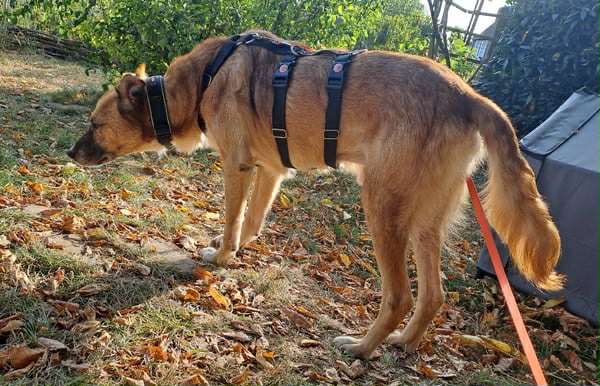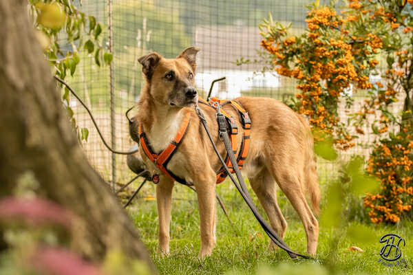So kam Domani Ende Juli 2025 auf seine Pflegestelle, ziemlich fertig und sehr beeindruckt von der neuen Umgebung. Er taute aber schnell auf und ist offen für neue Eindrücke. Er findet die anderen Hunde auf der Pflegestelle in Ordnung, auch die Katzen dürfen sich mal in sein Bett legen.