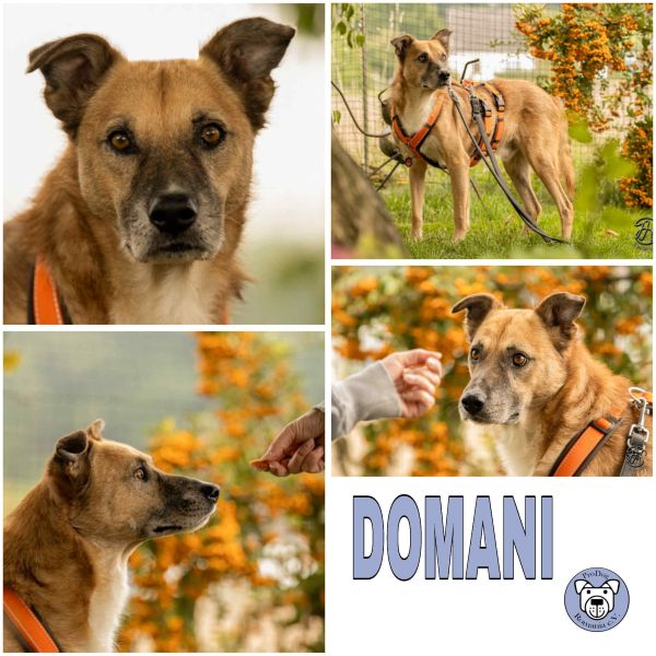 Domani lebte 4 Jahre in einem rumänischen Tierheim. Dort hielt er sich über drei Jahre vor den ehrenamtlichen Helfern, die die Hunde in diese Galerie einpflegen um gesehen zu werden, verborgen. Erst 2024 wurde er in einer Hütte entdeckt. Er war ein seelischer Notfall: völlig resigniert, hatte sich bereits aufgegeben, war zu dünn und hatte Hautprobleme.