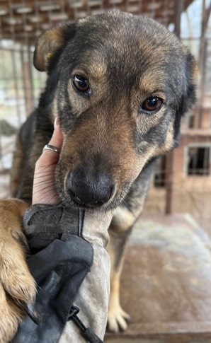 DUNCAN zeigte sich uns gegenüber als sehr menschenbezogenen Buben. Er hat sich richtig durchkuscheln lassen und nahm natürlich auch gern unsere Leckerchen. DUNCAN fraß erstmal gierig, als wir in den Kennel kamen, was eigentlich darauf schließen lässt, dass er aktuell nicht gut ans Futter gelassen wird. Er ist aktuell auch etwas zu dünn, aber bei unserem Besuch schien mit den anderen Hunden im Kennel, alles gut zu funktionieren.