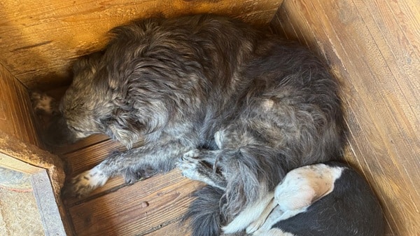 Er zeigte keinerlei Interesse an uns und lag in seiner Hütte. Mit seinen Kennelmitbewohnern kommt er gut aus. Seine Rute ist inzwischen verfilzt. Unter Bedrängung ist er weiterhin anfassbar, dies ist ihm ungewohnt.