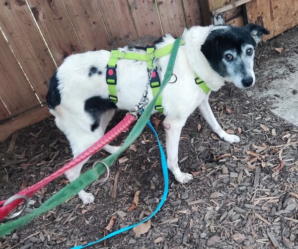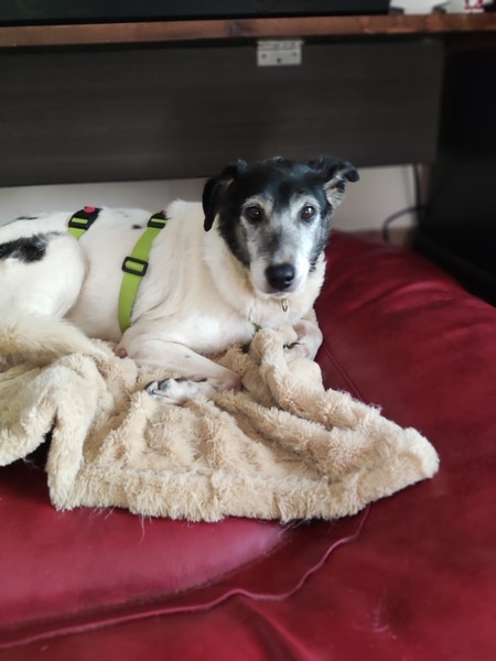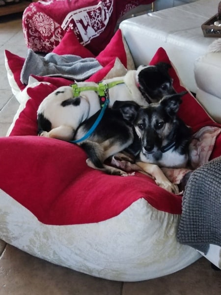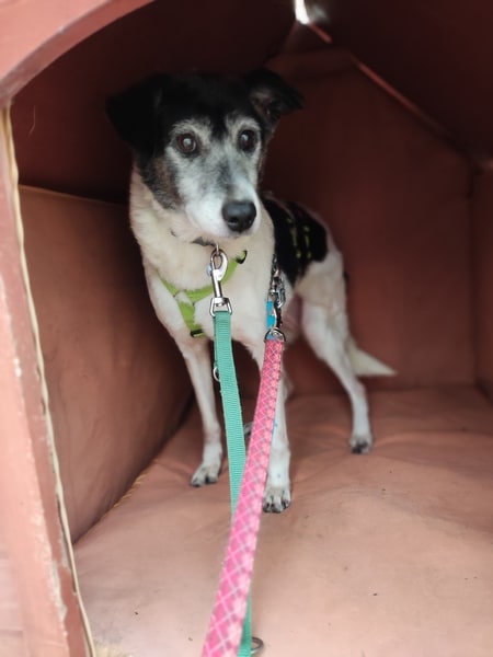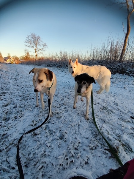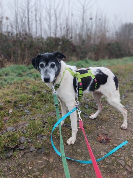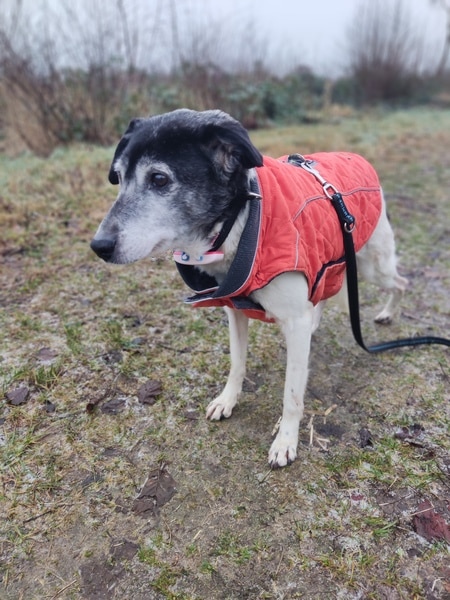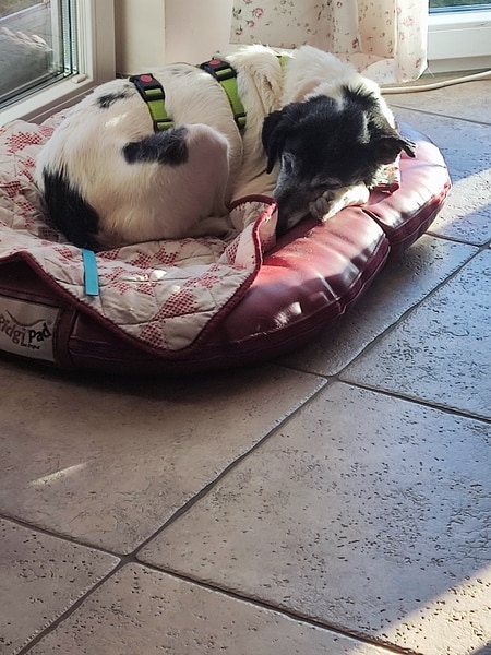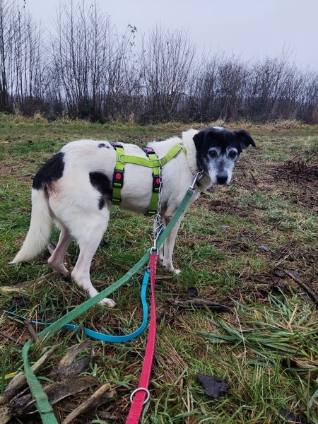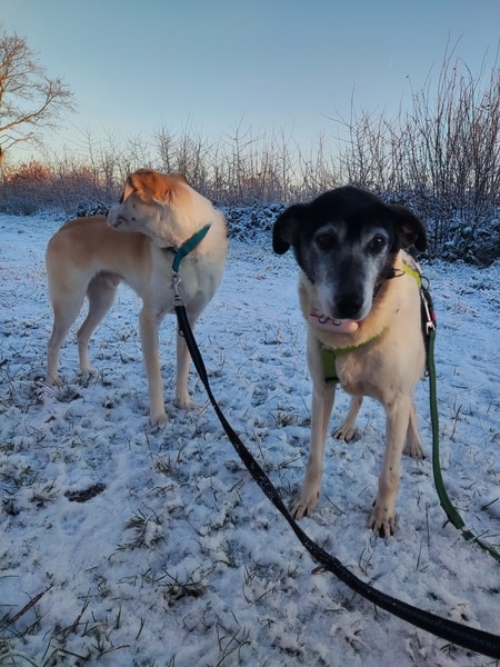 Zunächst noch zurückhaltend, ausweichend und mit den Situationen nicht vertraut, schaute sie sich alles in Ruhe an, nahm nach und nach bedächtig am Alltag teil. Viel schlafen, viel die alten Knochen im weichen Körbchen vergraben und einfach die Ruhe und Sicherheit sie umhüllen lassen, so verging die erste Zeit. Kleine Ausflüge in den Garten findet sie prima, aber es ist deutlich, dass es ihr im Haus doch besser gefällt und sie gerne wieder hineinkommt. Die ersten Gassigänge waren sehr beschwerlich; für uns beide. Viel gucken, ziehen und lieber wieder zurück wollen. Ihr reichte definitiv der Garten. Stück für Stück haben wir das ausgebaut, erweitert. Schließlich gibt es auch für eine noch mobile Omi viele schöne Gerüche da draußen wahrzunehmen. Inzwischen geht sie gerne mal eine gemütliche Runde mit ihren Pflegestellengeschwistern mit; aber immer mit ausreichend Pausen und Guck-und-Schnupper-Zeiten.