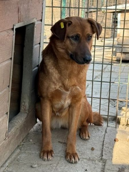 Dieses süße Mädel lag ganz entspannt im Futtertrog, während wir uns um die anderen Hunde kümmerten. Sobald wir uns ihr näherten, suchte sie jedoch Schutz hinter der Hütte. Gab man ihr dann Ruhe, kehrte sie wenig später an ihren Lieblingsplatz zurück. Wir sind überzeugt, dass sie bei regelmäßigem, liebevollem Kontakt mit Menschen schnell Vertrauen fassen wird.
