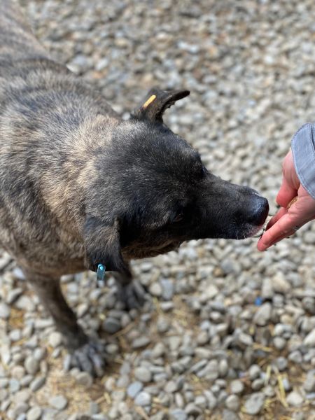 ENYA zeigte sich bei unserem Besuch freundlich, neugierig und interessiert, blieb stets in der Nähe und nahm unsere angebotene Leckerchen vorsichtig aus der Hand. Zu mehr fehlte ihr noch der Mut.