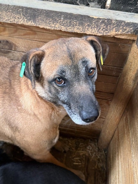 Dieser Rüde hielt sich in der Hütte auf, als wir den Kennel betraten. Er suchte aktiv keinen Kontakt zu uns und zeigte auch wenig Interesse an uns. In der Hütte unter Bedrängung zeigte er aus Unsicherheit Abwehrverhalten. Das Schnappen legte sich etwas, jedoch stand er weiterhin unter Anspannung. Genießen konnte er das Anfassen nicht.