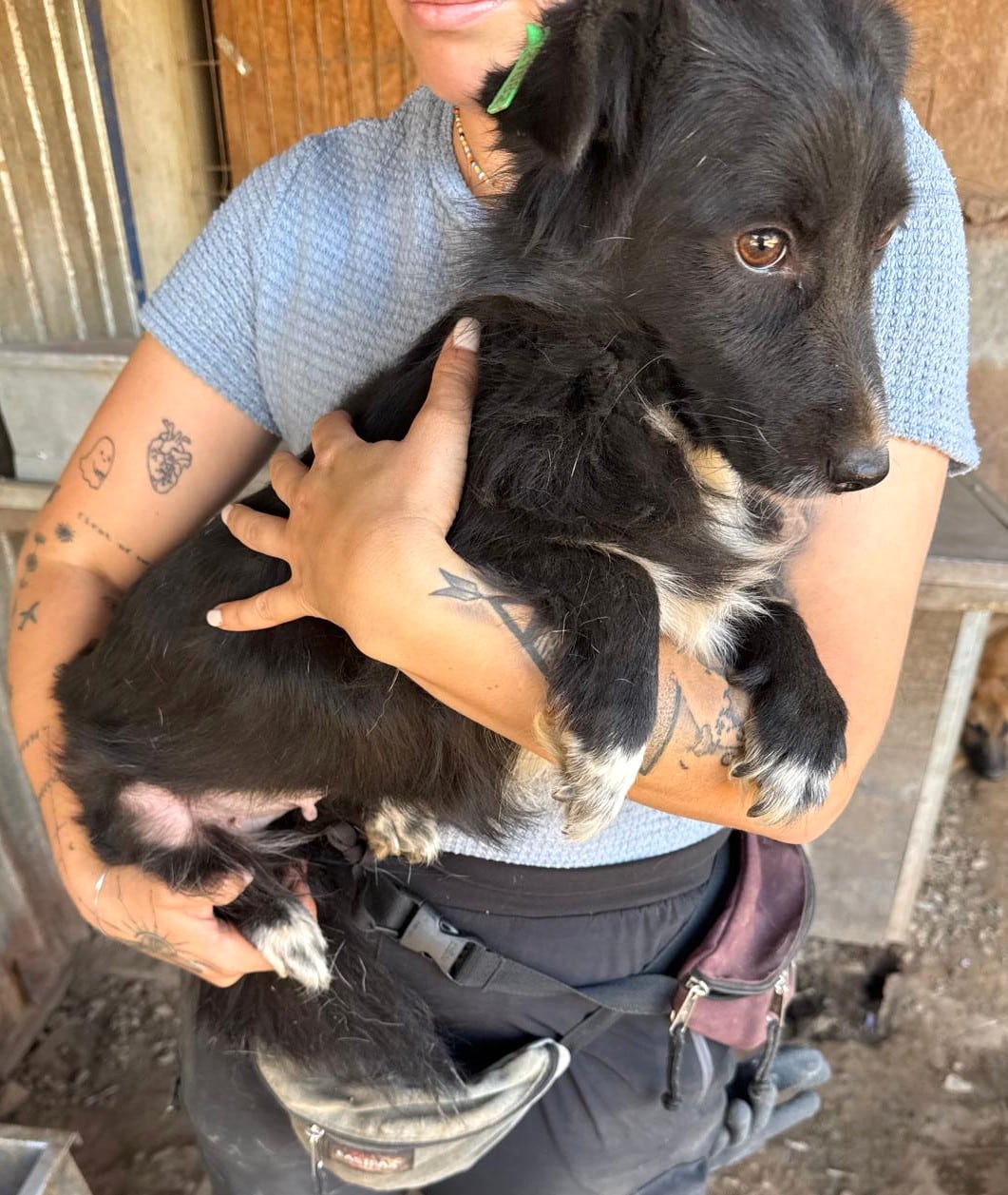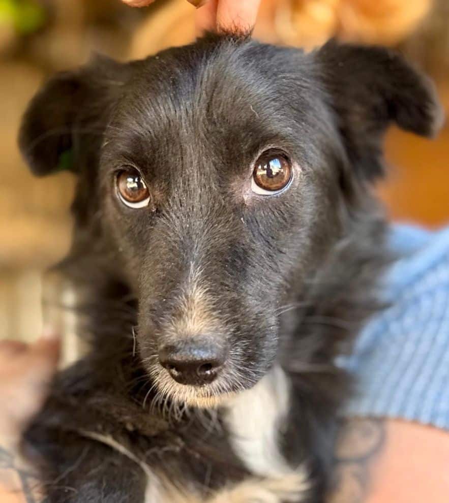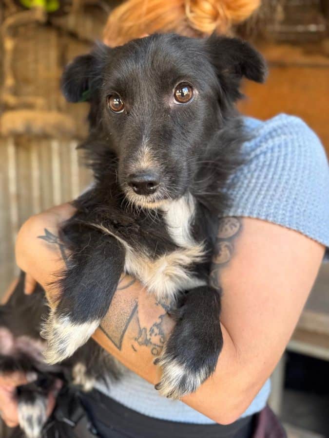 Die süße, kleine schwarze FIDELIS wirkt im ersten Moment noch etwas zurückhaltend. Zunächst blieb sie in ihrer Hütte und nahm nur vorsichtig Leckerchen vom Boden. Mit etwas Geduld ließ sie sich jedoch problemlos anfassen und sogar auf den Arm nehmen. Man merkt, dass sie es einfach noch nicht kennt – Abwehrverhalten zeigt sie dabei keines. Nach dem Absetzen zog sie sich langsam wieder in ihre Hütte zurück, denn die Aufregung im Shelter und im Kennel ist ihr einfach zu viel.