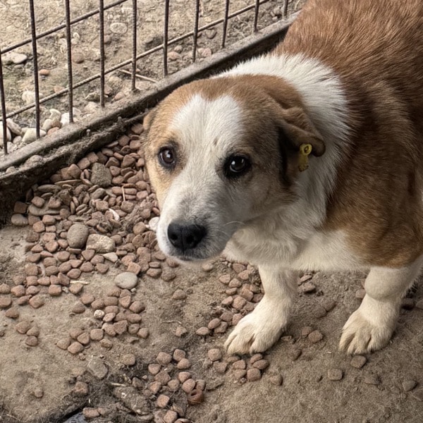FINN ist nach wie vor sehr unsicher im Umgang mit Menschen. Er nimmt zwar vorsichtig Leckerchen vom Boden, weicht jedoch zurück, sobald man sich ihm nähert, und zeigt dabei Abschnappverhalten. Vor Angst zittert er deutlich.