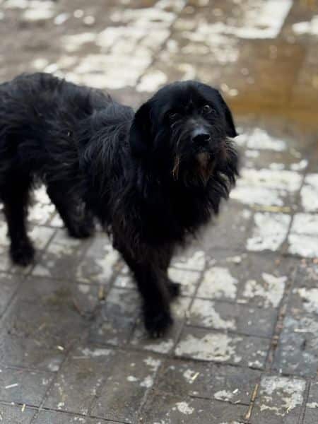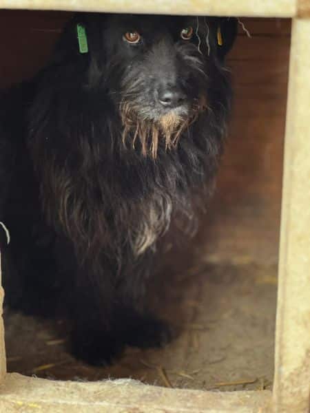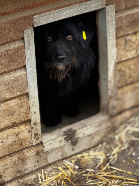 So neugierig und will andocken! Kam immer wieder zu uns und schnupperte an den Fingern. Für den letzten Schritt fehlte der Mut. In der Hütte konnten wir ihn unter Bedrängung gut anfassen. Schon nach wenigen Tagen wird man sein Herz erobert haben und einen fröhlichen Kumpel bei sich haben. In der gemischten Hundegruppe macht er sich sehr gut. Ärger möchte er nicht haben und geht dem aus dem Weg. Da er seit August 2025 im Shelter ist, hatte er bisher damit Erfolg. Hoffentlich wird er bald gesehen, damit diese stressige Zeit ein Ende hat.