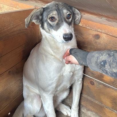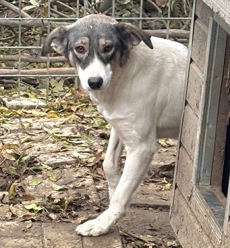 FREDERIKE sitzt in einem stressigen Junghundkennel und blieb lieber in ihrer Hütte. Als wir uns ihr zuwandten, konnten wir sie problemlos anfassen und aus der Hütte heben. Ganz geheuer war ihr das aber nicht. FREDERIKE hat Streicheleinheiten nie kennengelernt und braucht dringend positiven Kontakt zum Menschen. FREDERIKE hat starke Hautprobleme und sollte dringend ausreisen.