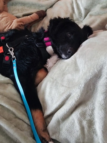 Ganz schnell hat sie sich ans Pflegefrauchen gehängt; dabei ist sie unaufdringlich und beobachtet viel. Laufe ich im Haus umher, legt sie sich im Körbchen ab, schaut, wartet und döst. Setze ich mich irgendwo hin, ist sie an meiner Seite, legt sich brav neben mich ab, wartet und döst weiter. Geht es raus in den Garten, wird mit Kalina kurz getobt, gespielt; dann reiht sie sich jedoch wieder an meiner Seite ein. Gehe ich rein, geht sie auch rein; alleine draußen bleiben mag sie (noch) nicht. Mögen die anderen allerdings auch nicht.