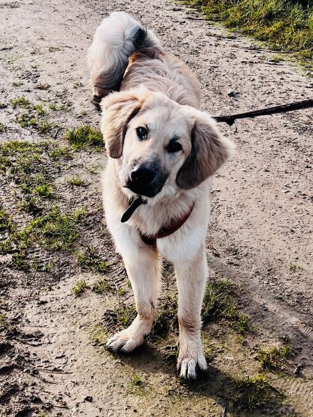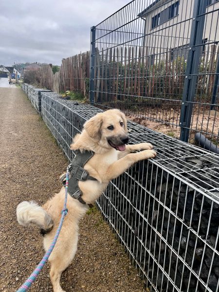 | Wesen & Zutraulichkeit (Character & Trustworthiness) | welpentypisch (typical for puppies), verspielt (playful), offen (open), freundlich (friendly), neugierig (curious), sehr menschenbezogen (very people-related), gerne anfassbar (likes to be touched), überall anfassbar (touchable everywhere), anfassbar (touchable), nimmt Leckerchen (takes goodies), zutraulich (trustful), benötigt Eingewöhnungszeit (takes time to settle in), kraftvoll (powerful) |