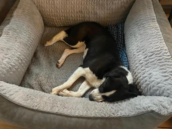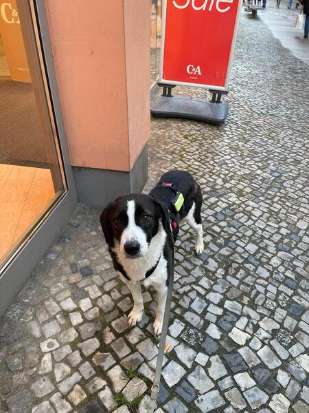 Beim Gassigehen in der Stadt zeigt sie sich ebenso souverän und kann problemlos an Autos, Fahrrädern oder anderen Zwei- und Vierbeinern vorbeigehen. In manchen Situationen ist sie vorsichtig, bisher aber nie panisch. Autofahren verträgt sie bisher nicht so gut, aber wir arbeiten daran und kürzere Strecken schafft sie nun auch schon ohne Übelkeit. Sie kann gut alleine bleiben (im Beisein einer oder der beiden anderen Hunde, wobei hier keine Interaktionen zu beobachten sind, sie schläft dann die meiste Zeit in ihrem Körbchen). Im Übrigen schläft sie auch gern aus… 😉